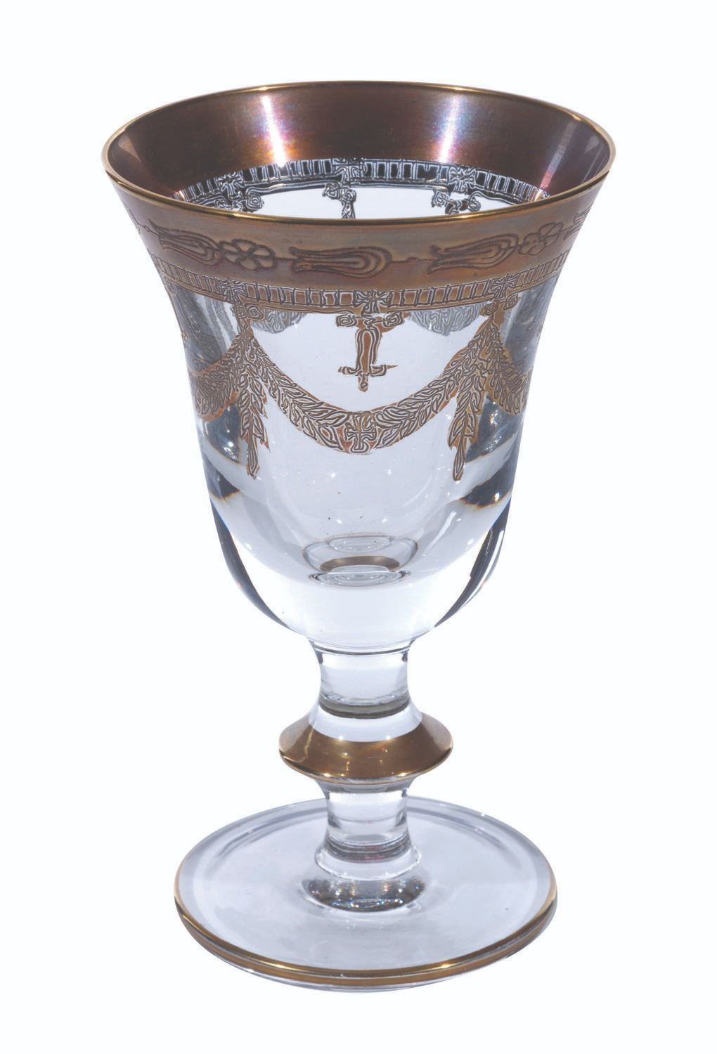 (Warner Bros., 2002) A screen-used prop water goblet from Harry Potter and the Chamber of Secrets. Glasses of this style can most notably be seen when McGonagall teaches Harry and his classmates the transfiguration spell, turning animals into these water goblets. Measuring 3.5" in diameter by 6" high, the glass goblet with gold foil decor is in very good screen-used condition.