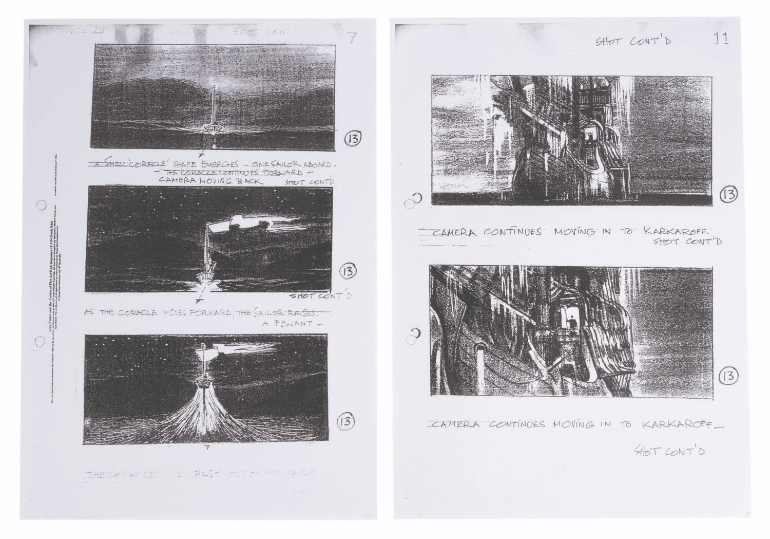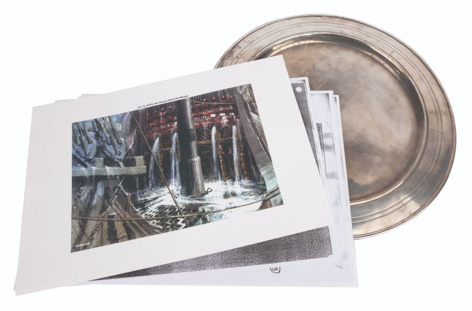 (Warner Bros., 2005) A prop Hogwarts Great Hall dinner plate, concept print, and six photocopy storyboard pages from "Harry Potter and the Goblet of Fire.” The impressive Durmstrang school sailing ship is depicted in the pages and concept print, emerging from the depths of Hogwarts’ Great Lake. Measuring 11.5” in diameter and 0.5” thick, the plate is in good condition with light tarnish and wear from production use, while the 8.25” x 11.75” print and storyboard pages are in very good condition with light edge wear and creasing.