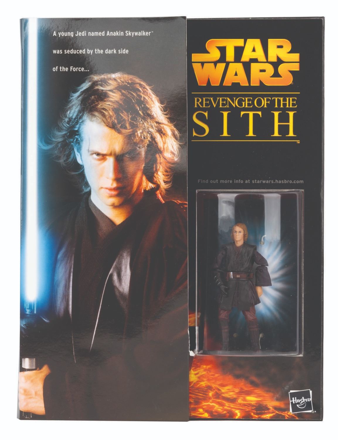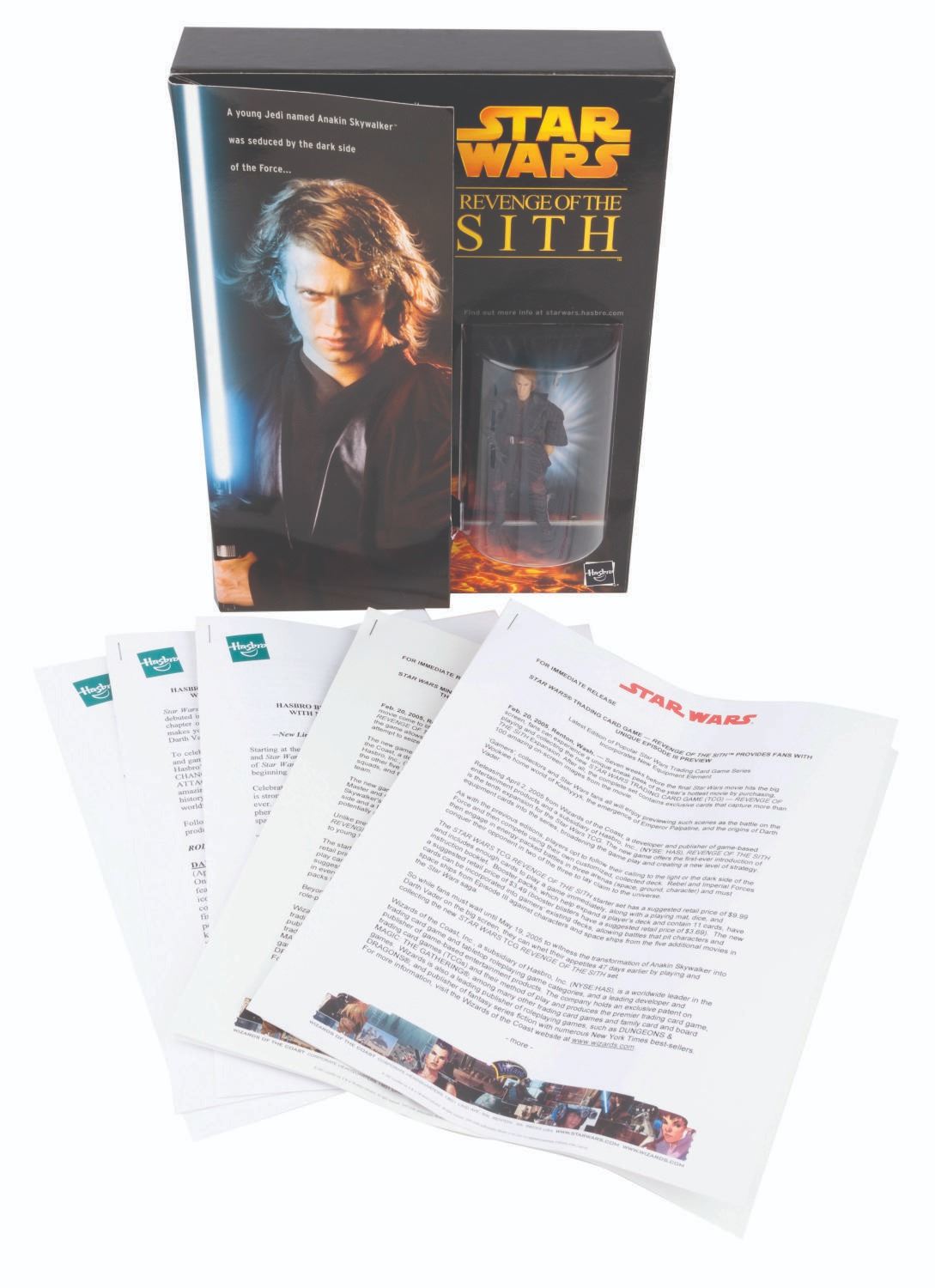 (Hasbro, 2005) A “Star Wars: Episode III - Revenge of the Sith” press kit. Included in the kit are an Anakin Skywalker action figure, a Darth Vader action figure, a CD-ROM, and five press releases. The kit is in very good condition with light scratches, wear, a tear on the inner sleeve, and folds on the press releases. The 4” action figures are loose in the box and appear to be in fine condition.