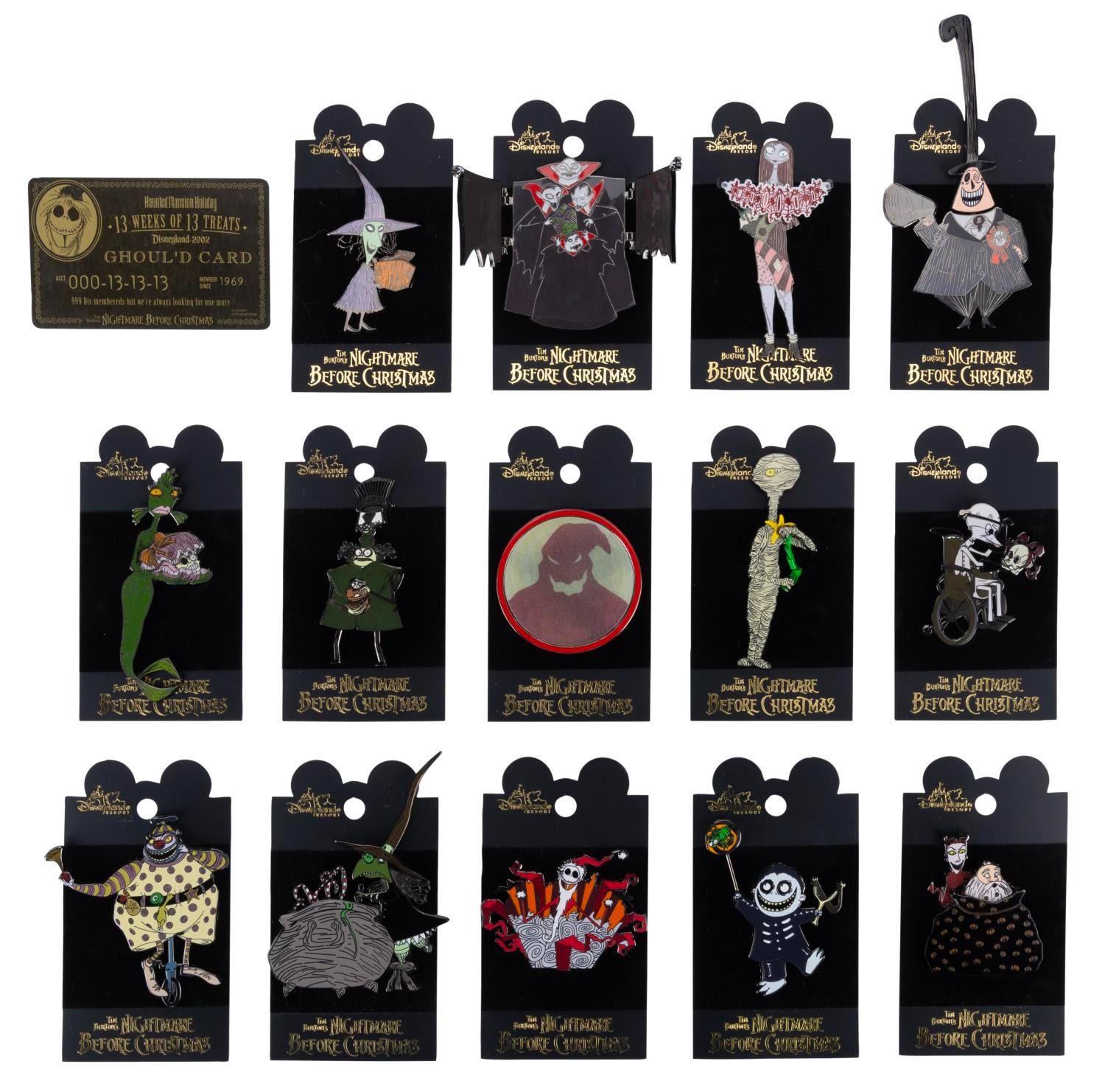 (Disneyland, 2002) A "13 Weeks of Nightmares" 14-pin set from Disneyland Resort. This set was limited to an edition of 3,500 and includes the "Ghoul'd Card" checklist and its 14th pin, issued to Guests who purchased all 13 pins in the set. Measuring 2" to 4.5" long, each pin is in fine condition on its original card.