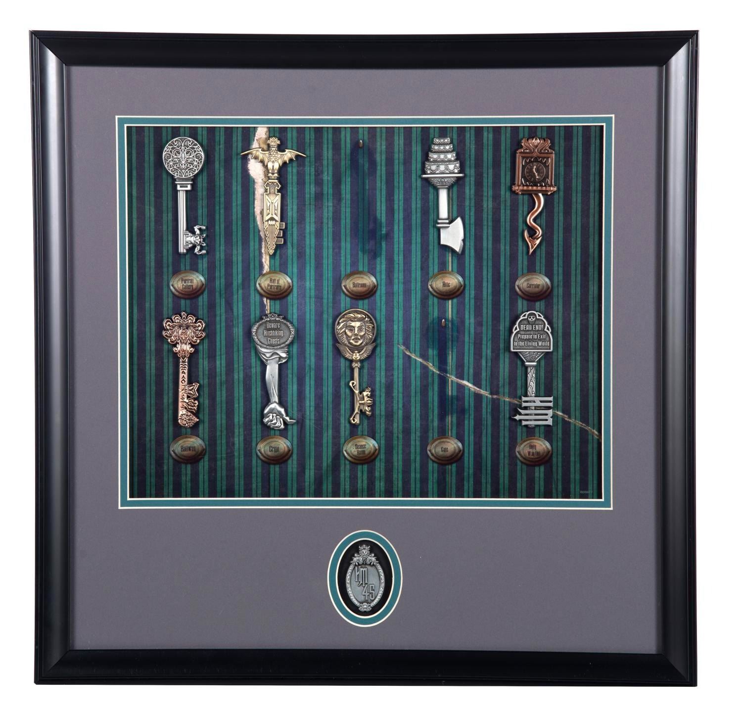 (Disneyland, 2014) A Haunted Mansion 45th Anniversary framed key set, released in a limited edition of 100. The piece features a Haunted Mansion Plaque logo and eight keys, with spaces for two more. Measuring 19" x 19.5", the set is in fine condition.