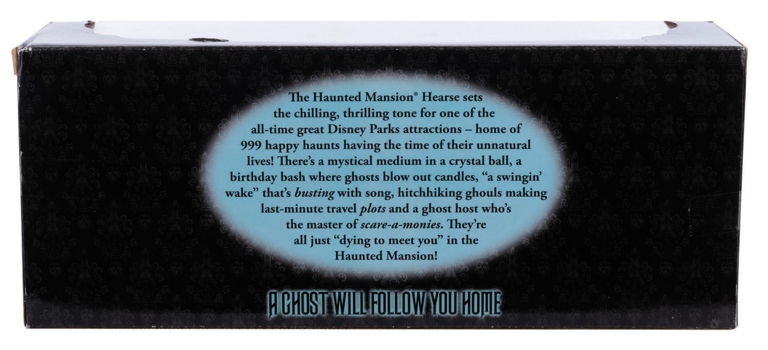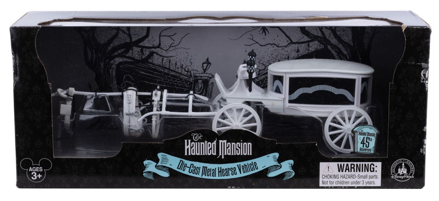 (Disney Parks, 2014) A Haunted Mansion Hearse Vehicle. This Haunted Mansion Authentic Die-Cast Metal Hearse Vehicle was offered to coincide with the 45th anniversary of The Haunted Mansion at Disney Parks. The piece is in fine condition within its 13.25"x3.5" and 3.75" deep good condition box.