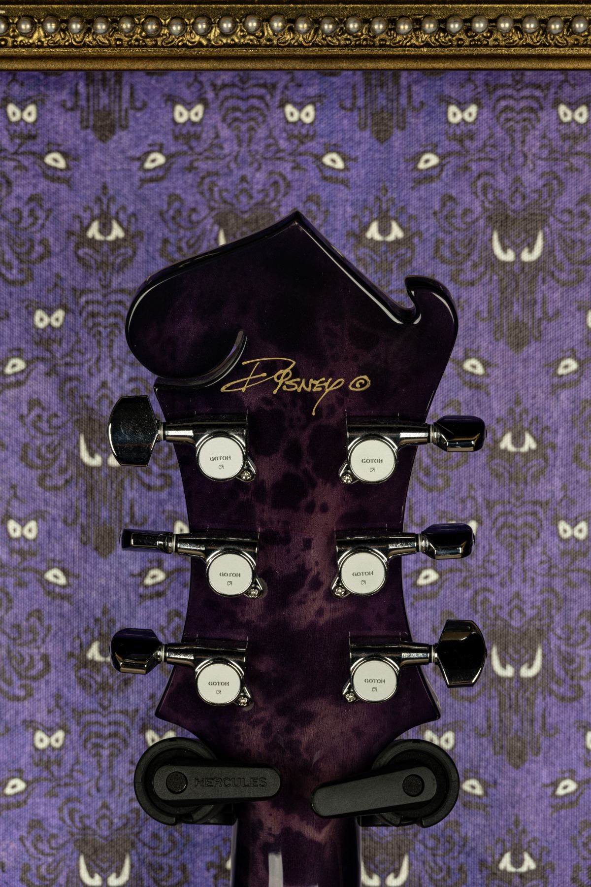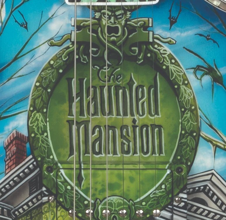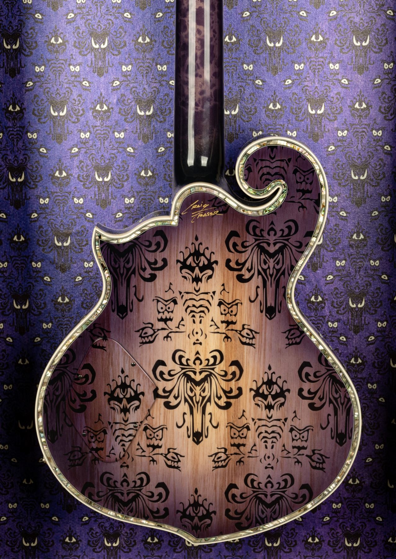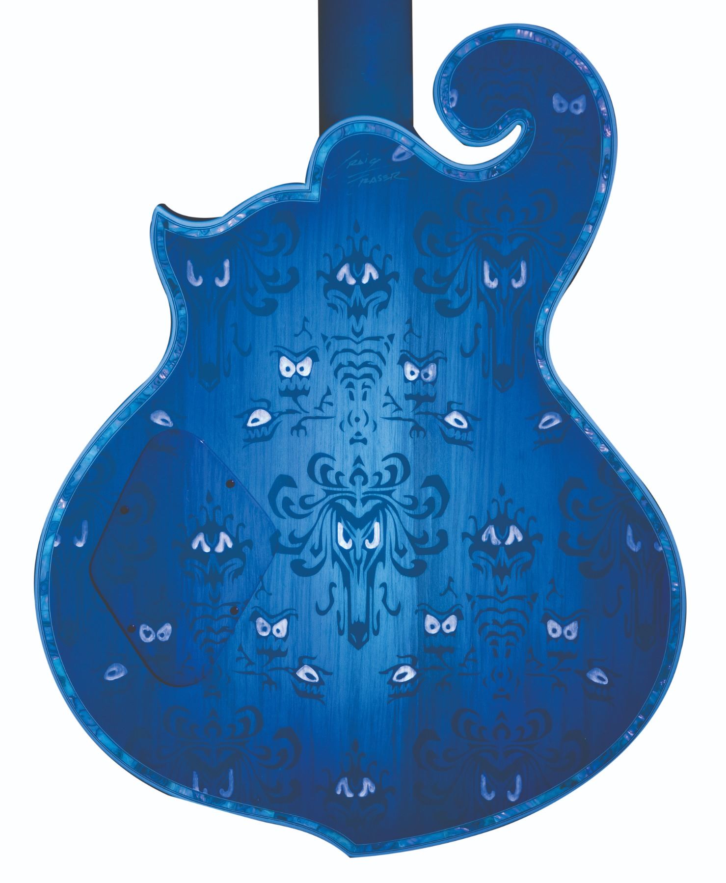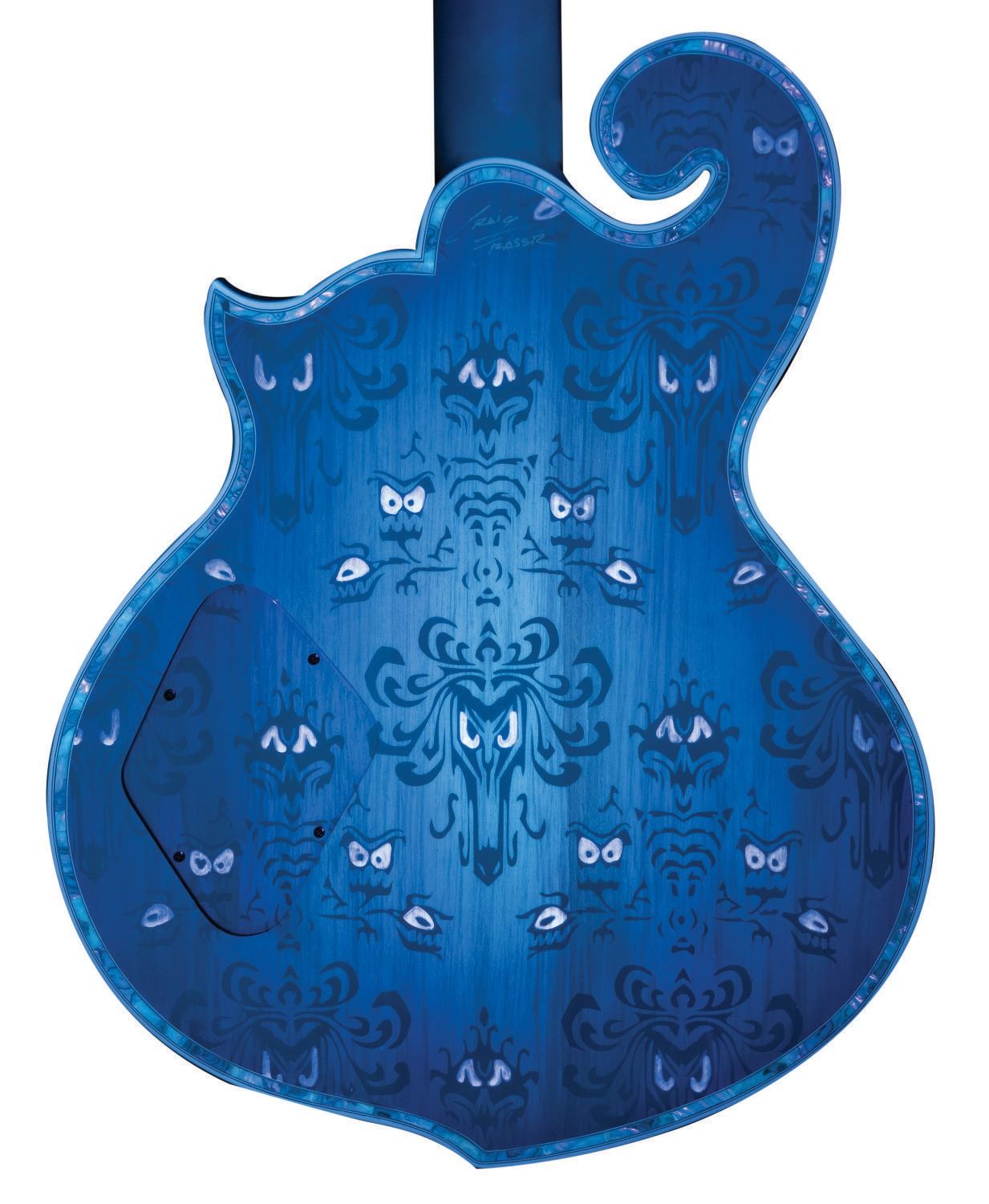 (Disney, 2019) An extremely rare and unique Minarik Electric Guitar custom-built for the 50th Anniversary of the Haunted Mansion. Only 13 of these incredibly detailed guitars were built. Each individually numbered guitar has features unique to that guitar, making each instrument one-of-a-kind. This guitar, numbered "3", features a inlaid Mother-Of Pearl Headstock, an ebony neck with inlaid stone "wrought iron", an abalone trimmed body and amazing detailed airbrushing by artist Craig Fraser. The back of the body features a Haunted Mansion Wallpaper design also on the control cover. In addition, the artwork contains three hidden mickeys (corresponding to the guitar number), as well as artwork that only appears under black light. The guitar also includes a single Seymour Duncan Custom Shop Trembucker pickup ensuring an amazing sound. Artist Craig Fraser built a custom one-of-a-kind display for this particular guitar featuring Haunted Mansion wallpaper motif and miniature illuminating bat candelabras. The guitar, case, display, and COA have been signed by artist Craig Fraser, while the case has been signed by guitar maker Marc Minarik. Measuring 51.25"x26" and 9.5" deep, the display is in fine working condition. Measuring 40" long with a 14" wide body, the guitar is in very fine condition. The Art of Disney Certificate of Authenticity is included.
