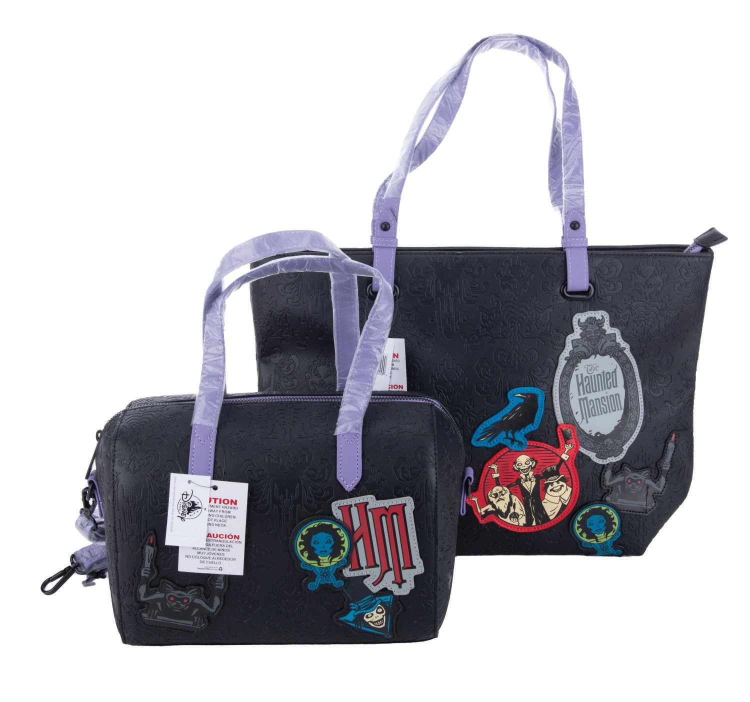 (Disneyland, 2020) A Disney Parks Haunted Mansion 50th Anniversary Hitchhiking Ghosts Satchel Purse & Tote Bag by Loungefly. The bags are embossed with matte black wallpaper print, feature appliques of the Hitchhiking Ghosts, Madame Leota, Raven, and Gargoyle Candleholder, and are in fine unused condition.
