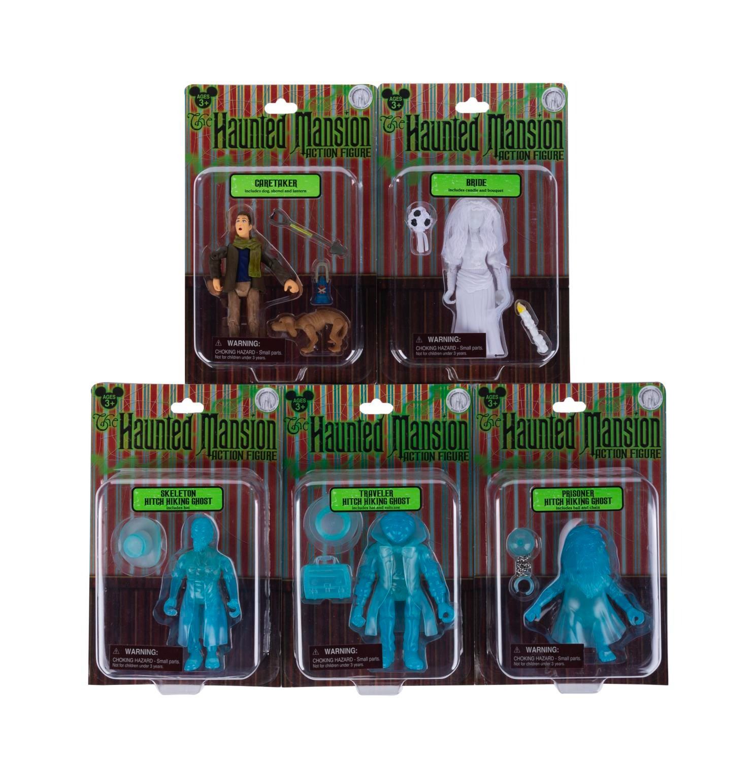 (Disneyland/Walt Disney World, 2000s) Five Disney Parks Haunted Mansion Action Figures including Constance the Bride, the three Hitchhiking Ghosts, and the Caretaker. Each figure features character-specific accessories and is in fine condition sealed on its original card.