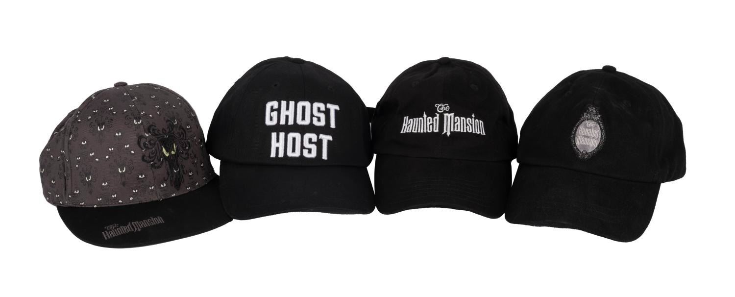(Disney Parks/WDI, 1990s-2000s) Four Haunted Mansion Baseball Caps including a pair of Imagineering-exclusive adjustable hats, a gray wallpaper demon hat (youth size), and a Disney Parks Ghost Host hat (adult adjustable size). Each piece is in fine condition with the original tags attached.