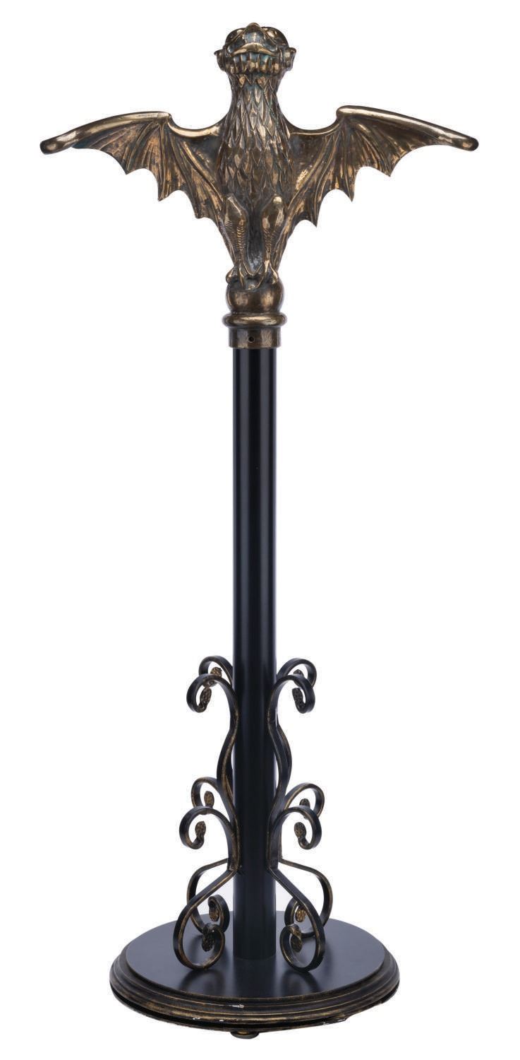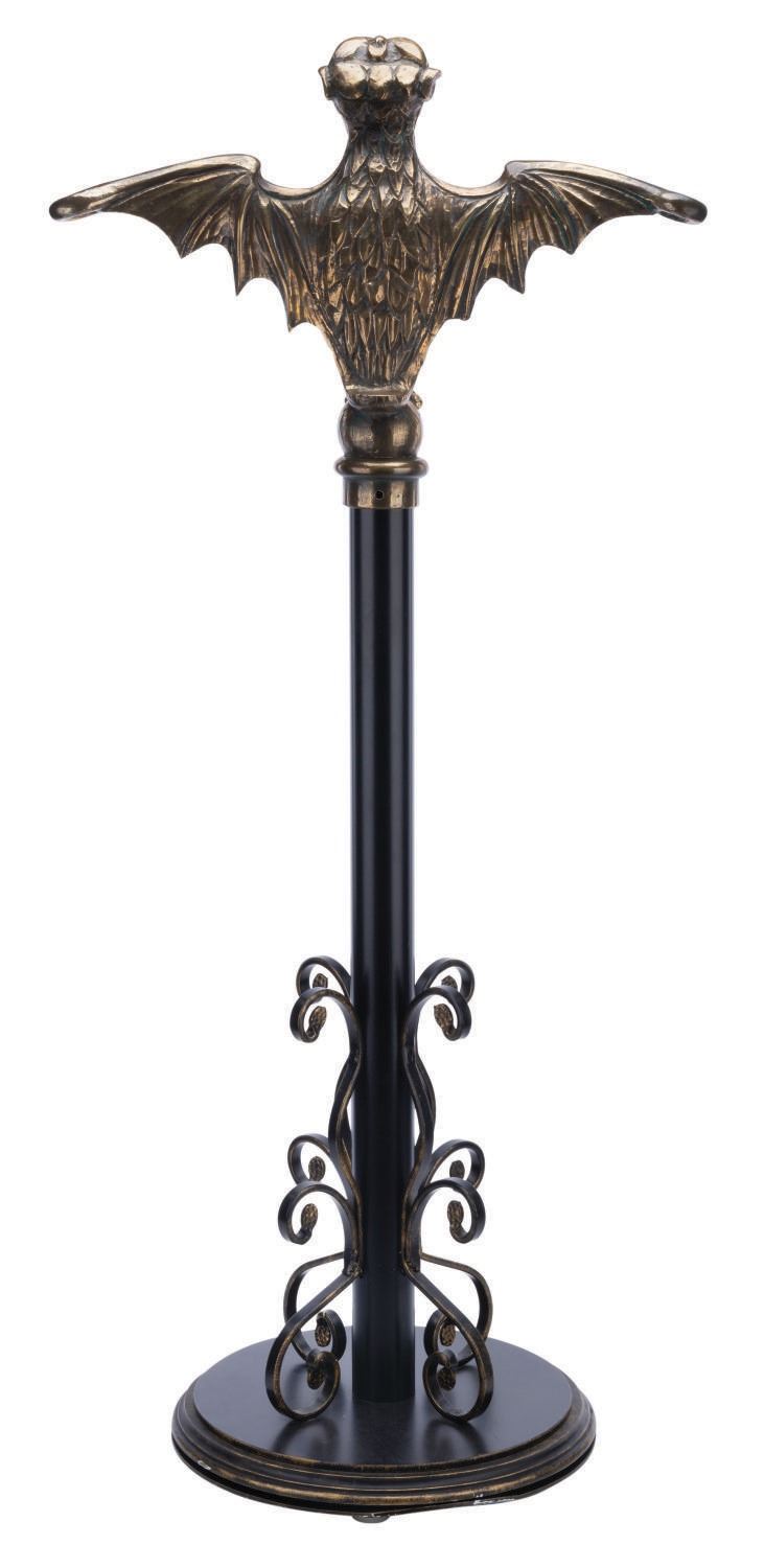 (Disneyland, 1980s) An extremely rare original Bat Stanchion from The Haunted Mansion at Disneyland. This is one of many Haunted Mansion Bat Stanchions whose grotesque grin have guided millions of "Foolish Mortals" through the queue and toward the realm of the supernatural Haunted Mansion. Measuring 14.25" tall, 19" wide and 4" deep, the metallic bat prop is in very good condition with scuffs, indents, scratches and wear from Park use, handling, and age. Only a handful of these props are in private hands and this is one of only two we have seen offered in auction. To complete the display, the artifact has been mounted atop a decorative pole with 13" diameter base and measures a complete 44.5" tall. Due to weight and size, special shipping arrangements may be necessary. Please inquire before bidding.