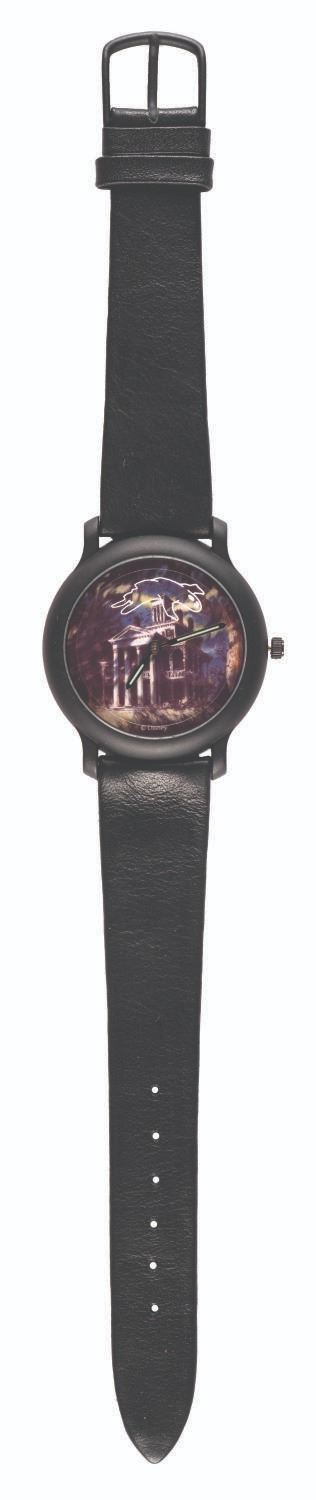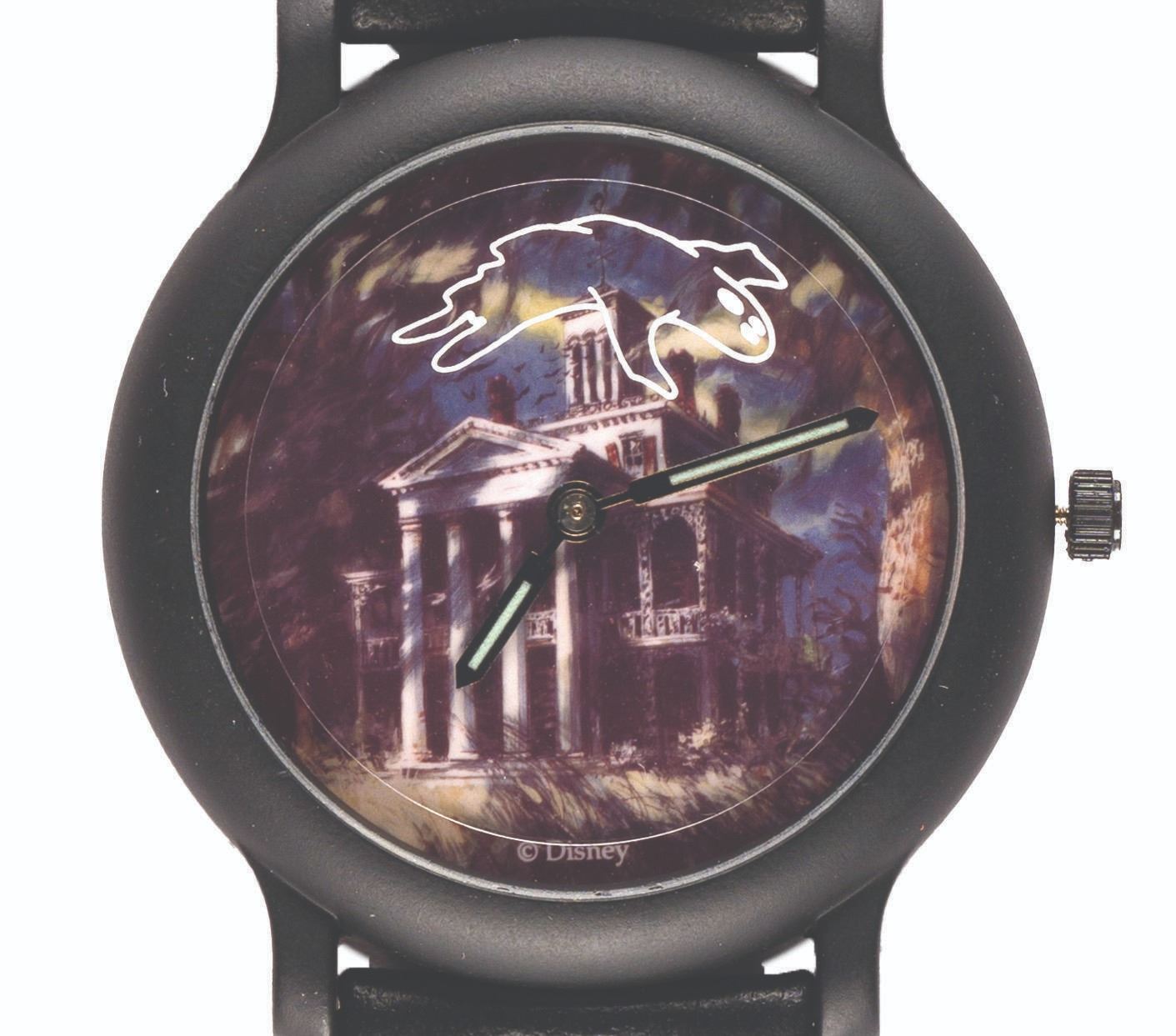 (Disneyland, 1990s) A Haunted Mansion Cast Member Exclusive Watch by Ballanda Corp. The watch was issued to Disneyland Cast Members during the 1990s, features a Haunted Mansion face, glow-in the dark hands, and "flying" ghost second hand. Measuring 1.25" in diameter, the battery-operated timepiece is in fine condition with its leather band and original sleeve.