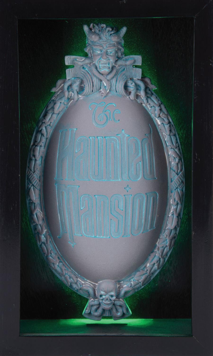 (Disney Parks, 2000s) A miniature "Dearly Departed" replica of The Haunted Mansion main gate plaque at Disney Parks. The piece was designed by artist Randy Noble and once available exclusively in a limited edition of 999, through "The Haunted Mansion 999 Happy Haunts Ball" at The Magic Kingdom. The piece requires two AAA batteries (not included). Measuring 9" tall and 5.5" and 2.5", the piece is in fine working condition, with slight oxidation in the battery compartment.