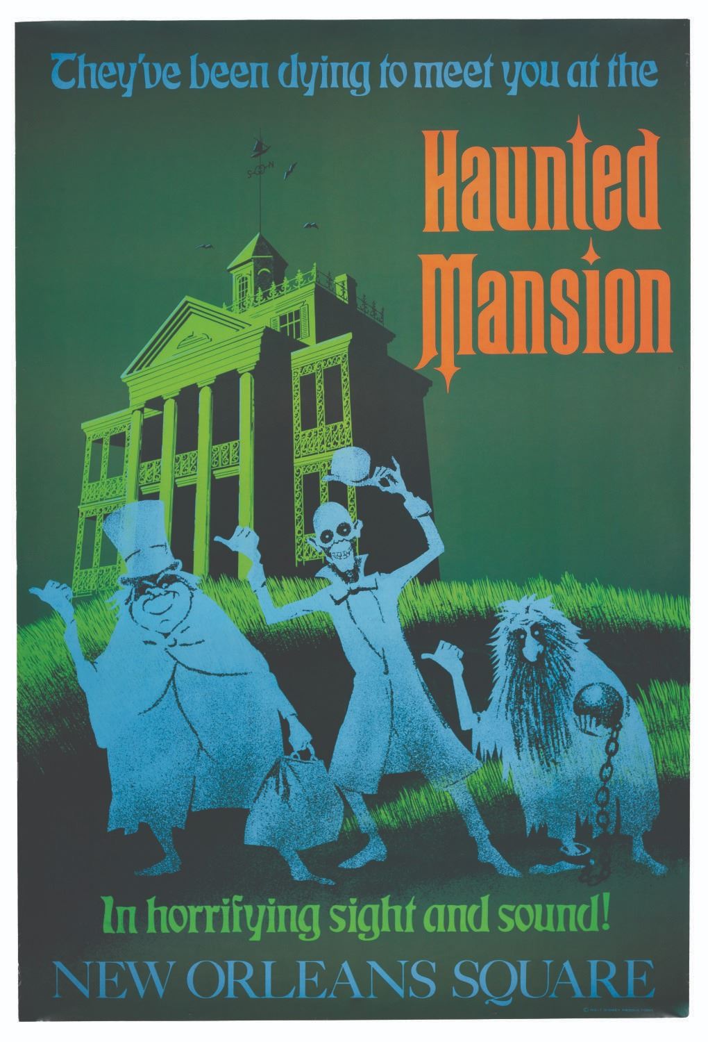 (Disneyland, 1990s) A printed reproduction Haunted Mansion attraction poster from the Disney Gallery. For a very short period, Disneyland offered these full-size reproductions of the Park's iconic attraction posters at the Disney Gallery. These posters are incredibly sought-after by fans. Measuring 36" x 54", the poster is in very good condition with very light creasing and minimal edge wear mainly along the left edge.