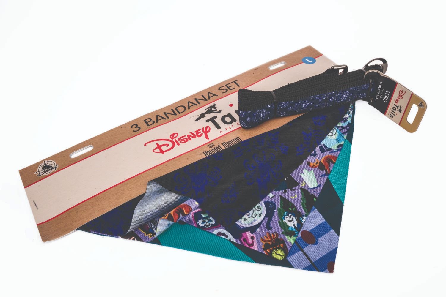 (Disney, 2019) A Disney Tails Pet Collection Haunted Mansion bandana and lead set. The Lead measures 1"x4', is intended for dogs 20-90 Lbs. and is in fine condition on its original card. Each bandana measures a size "Large," fits an adjustable 16" to 26" collar, and is in fine condition on its original card.