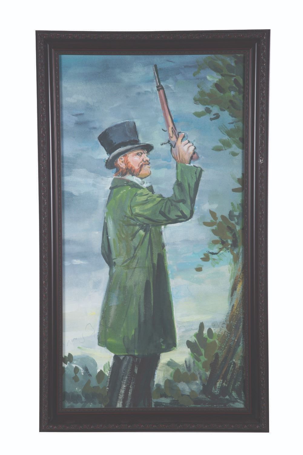 (Disney) A Haunted Mansion right-facing Dueling Ghost framed print. Measuring an image size of 30.5"x16" in its 34.5"x20.25" frame, the piece is in fine condition.