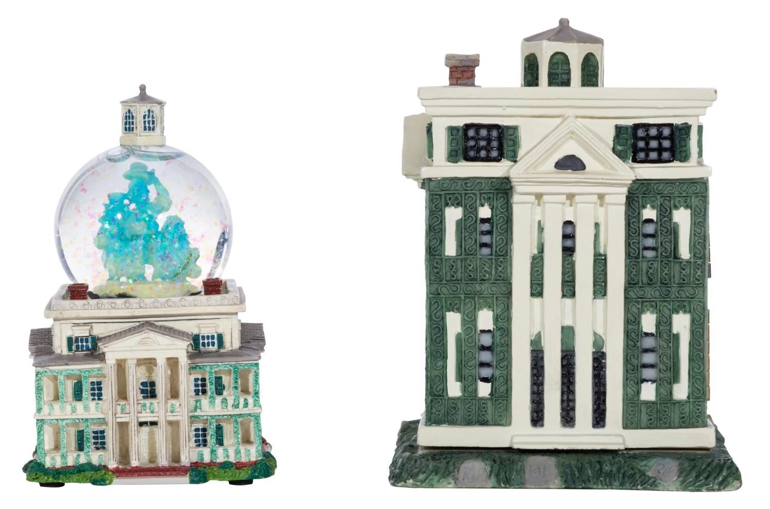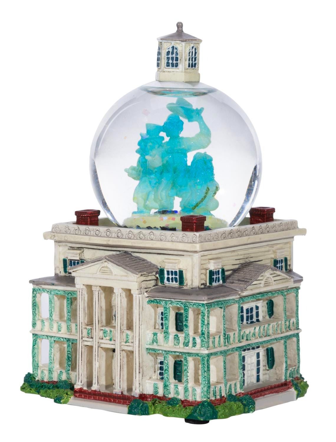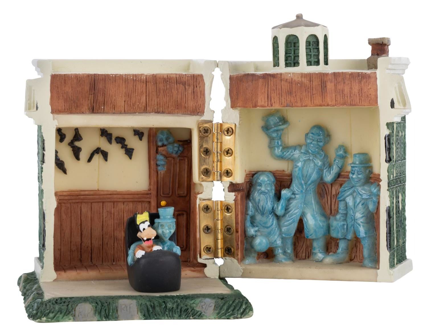 (Disneyland, 1990s) A figural box and mini snow globe of the Disneyland Haunted Mansion. The box opens to reveal the Hitchhiking Ghosts and Goofy in a Doombuggy. The mini snow globe features the Hitchhiking Ghosts atop the Mansion. The globe has a music feature that requires 3 AG3 batteries (not included). The 4.5" tall box and 4" snow globe are both in fine condition.