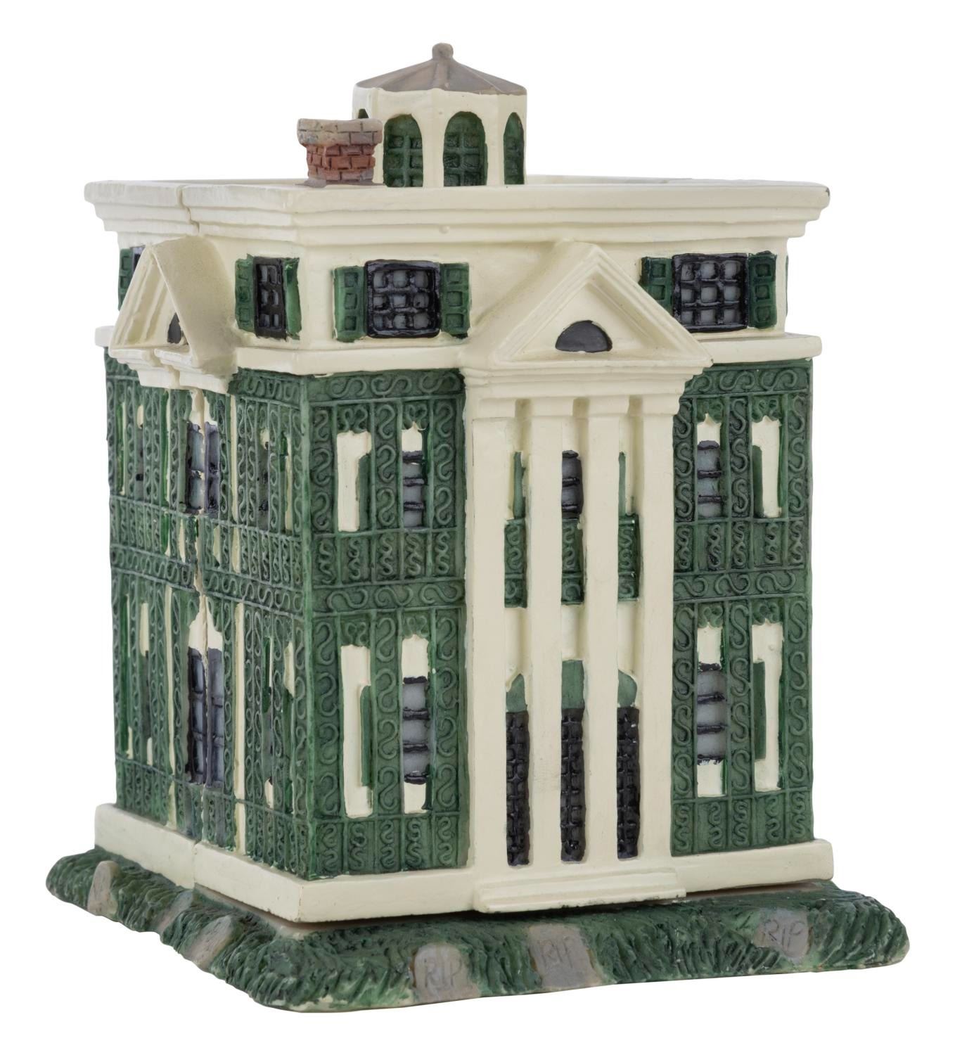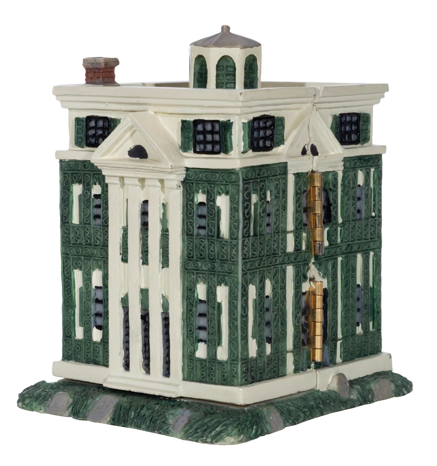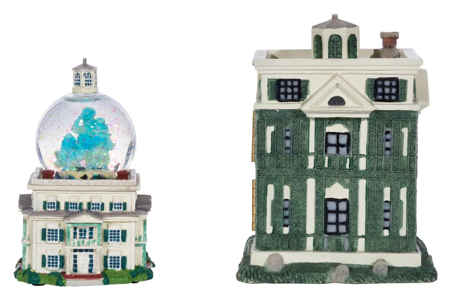 (Disneyland, 1990s) A figural box and mini snow globe of the Disneyland Haunted Mansion. The box opens to reveal the Hitchhiking Ghosts and Goofy in a Doombuggy. The mini snow globe features the Hitchhiking Ghosts atop the Mansion. The globe has a music feature that requires 3 AG3 batteries (not included). The 4.5" tall box and 4" snow globe are both in fine condition.