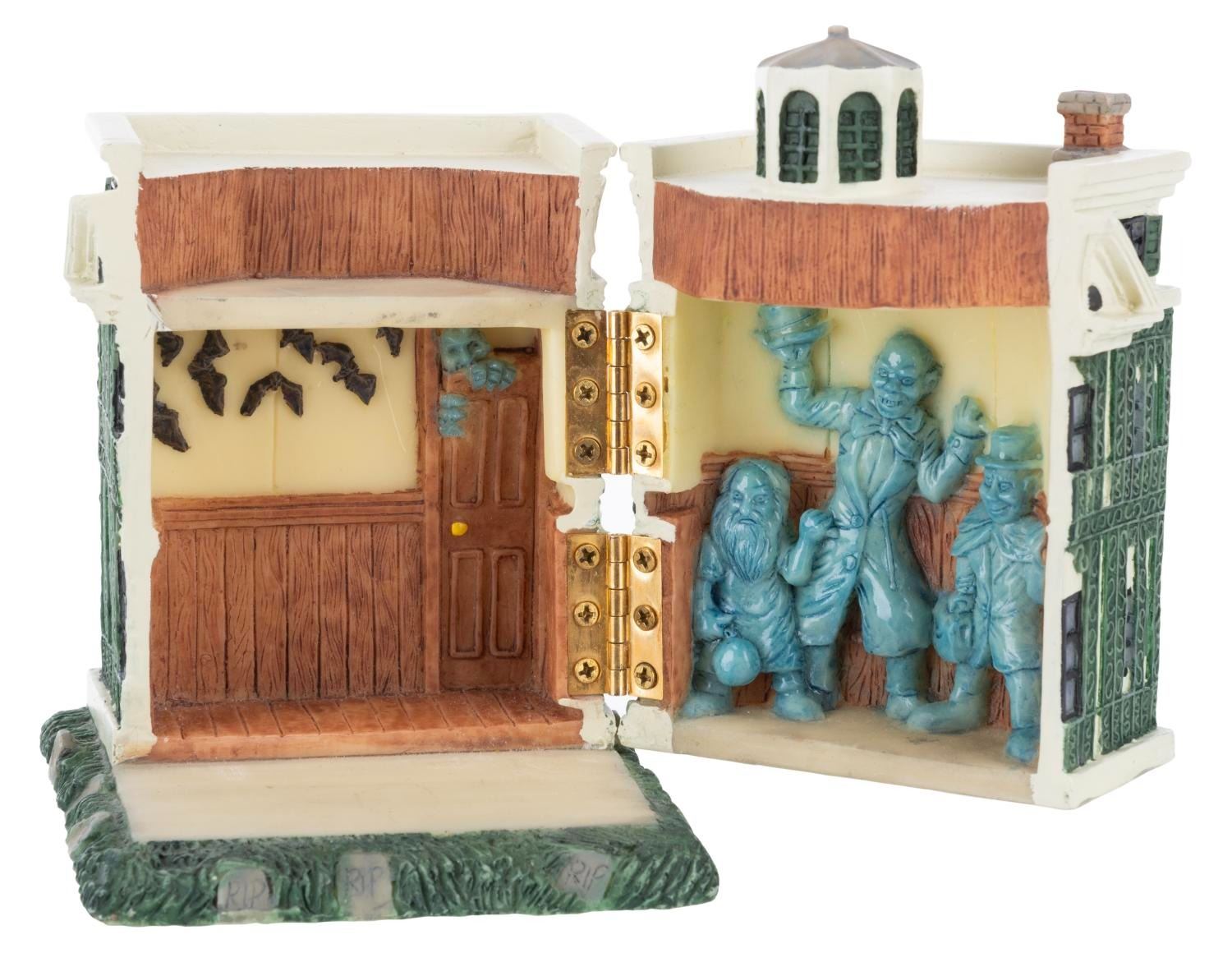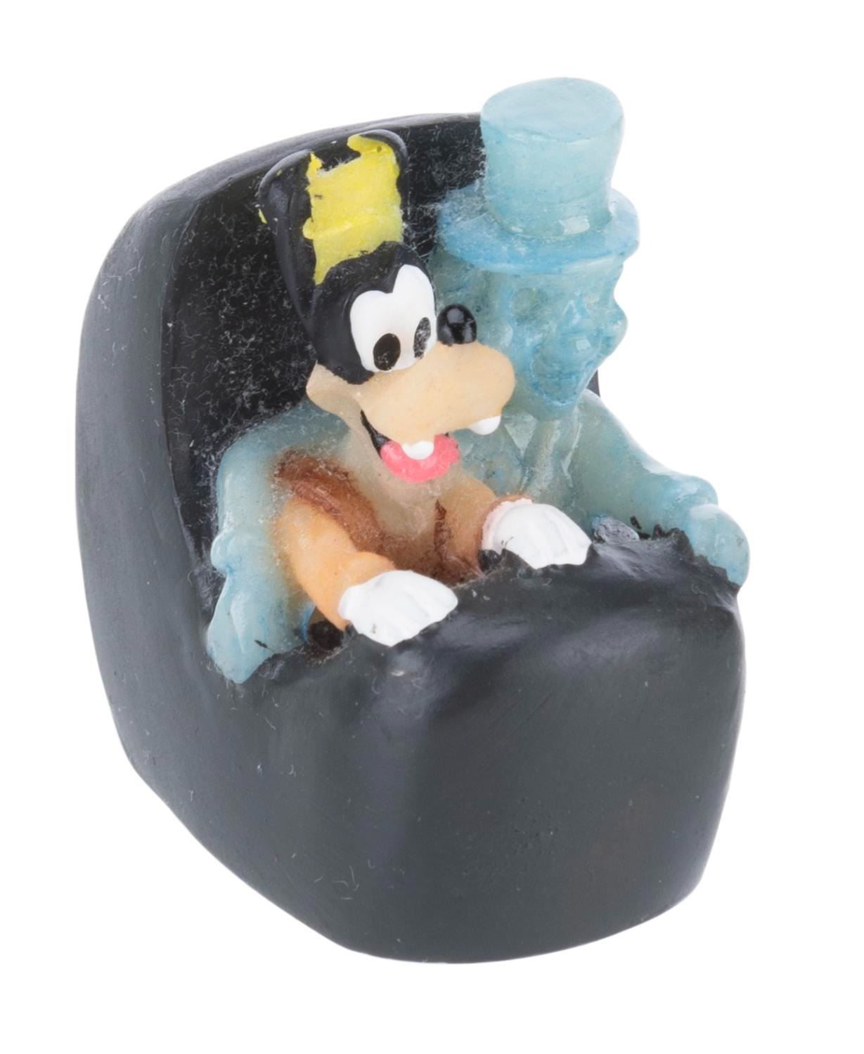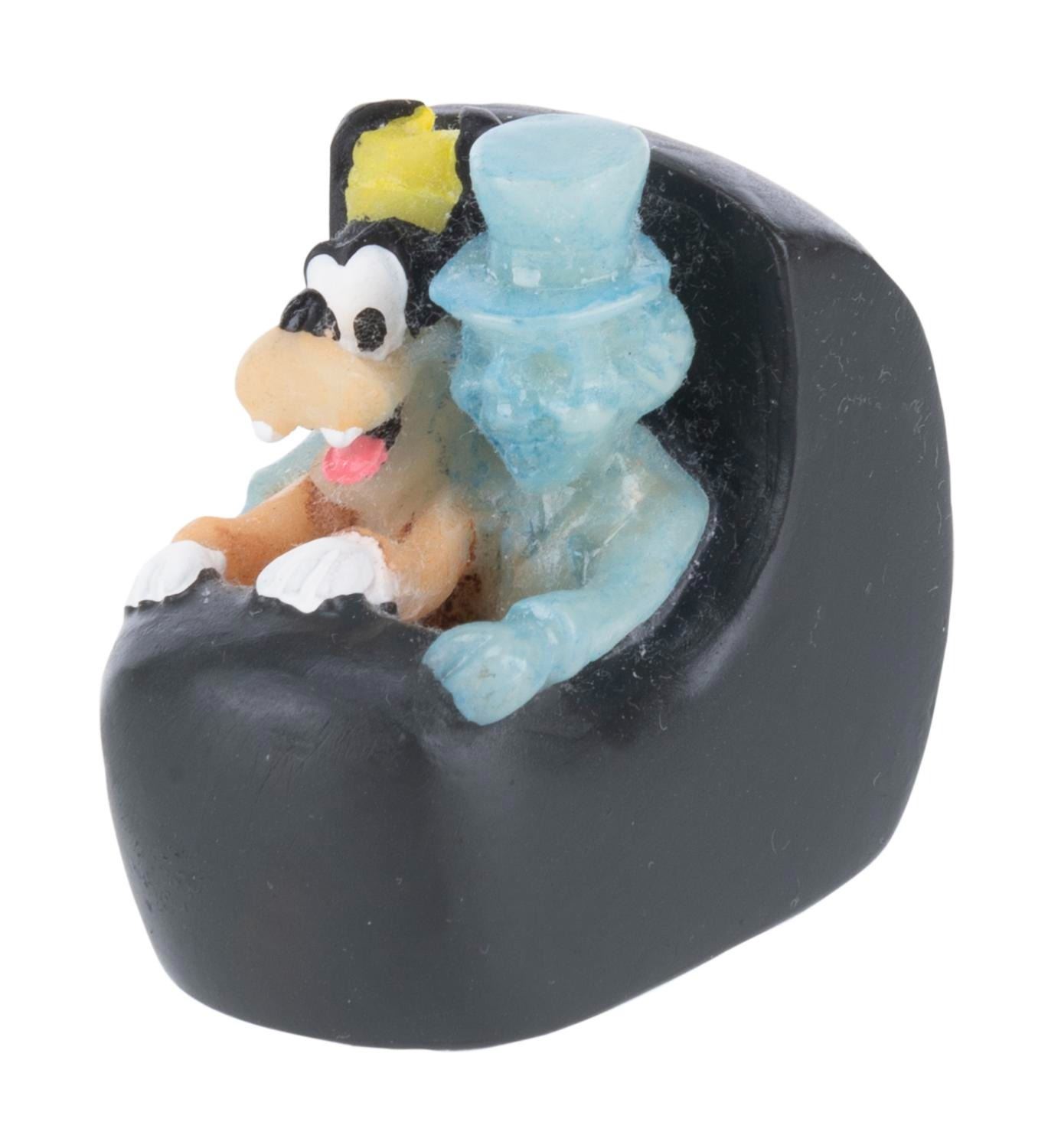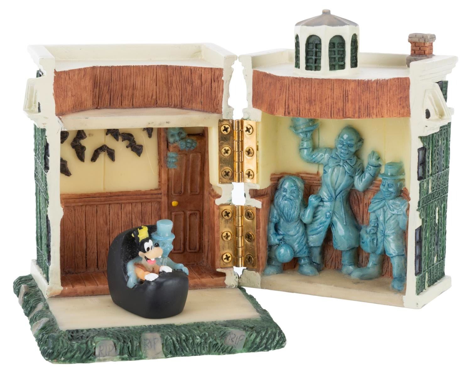 (Disneyland, 1990s) A figural box of The Haunted Mansion that opens to reveal the Hitchhiking Ghosts and Goofy in a Doombuggy. Measuring 3” x 3” x 4” tall, the resin box is in very good condition with light wear.