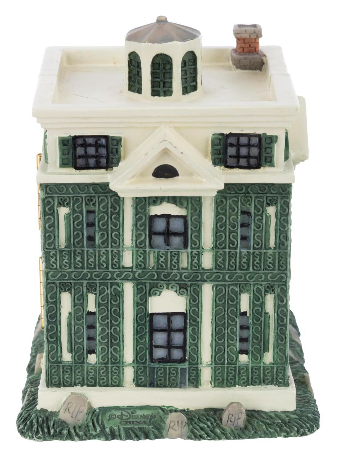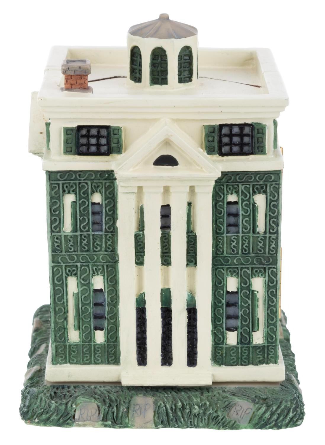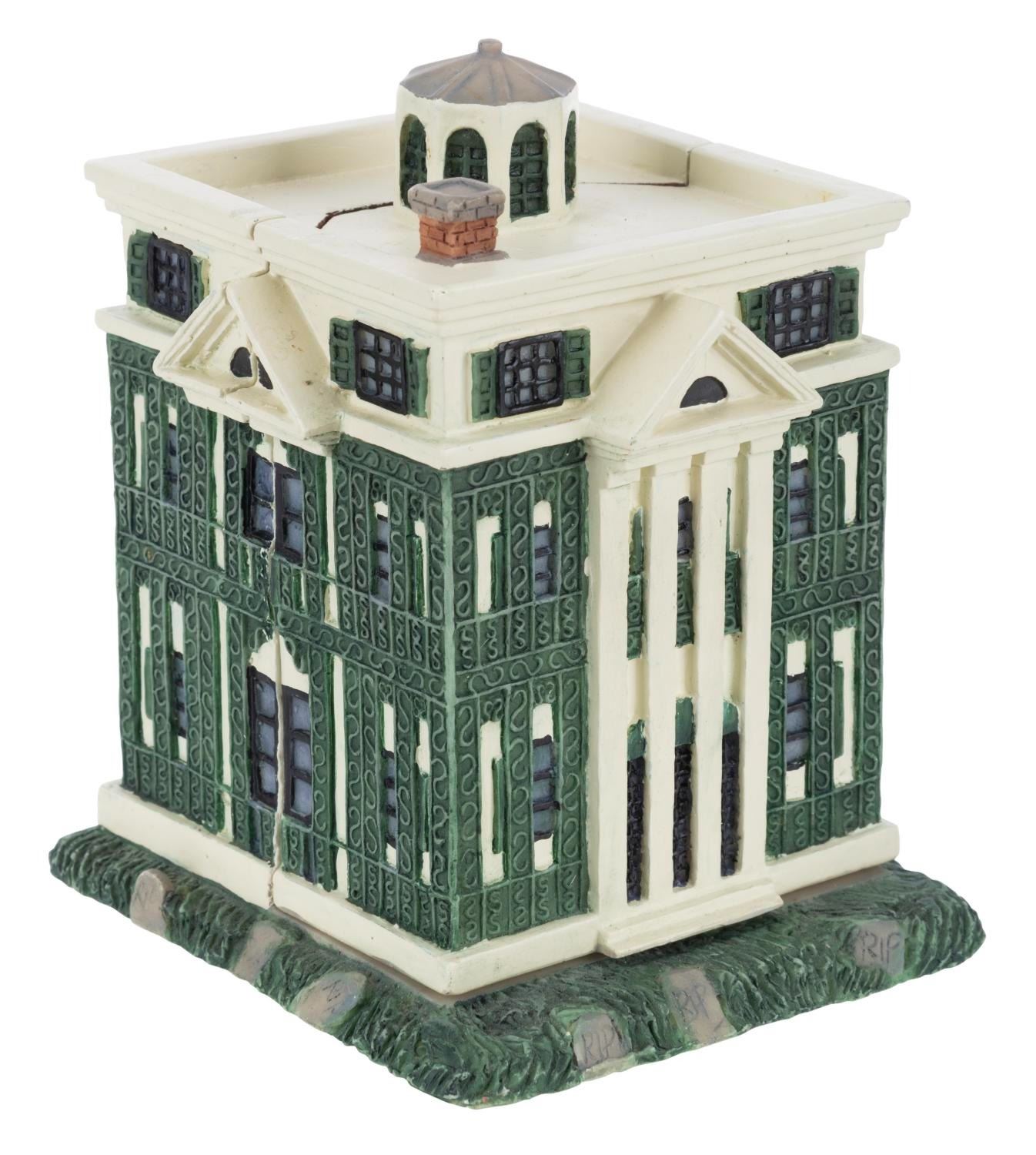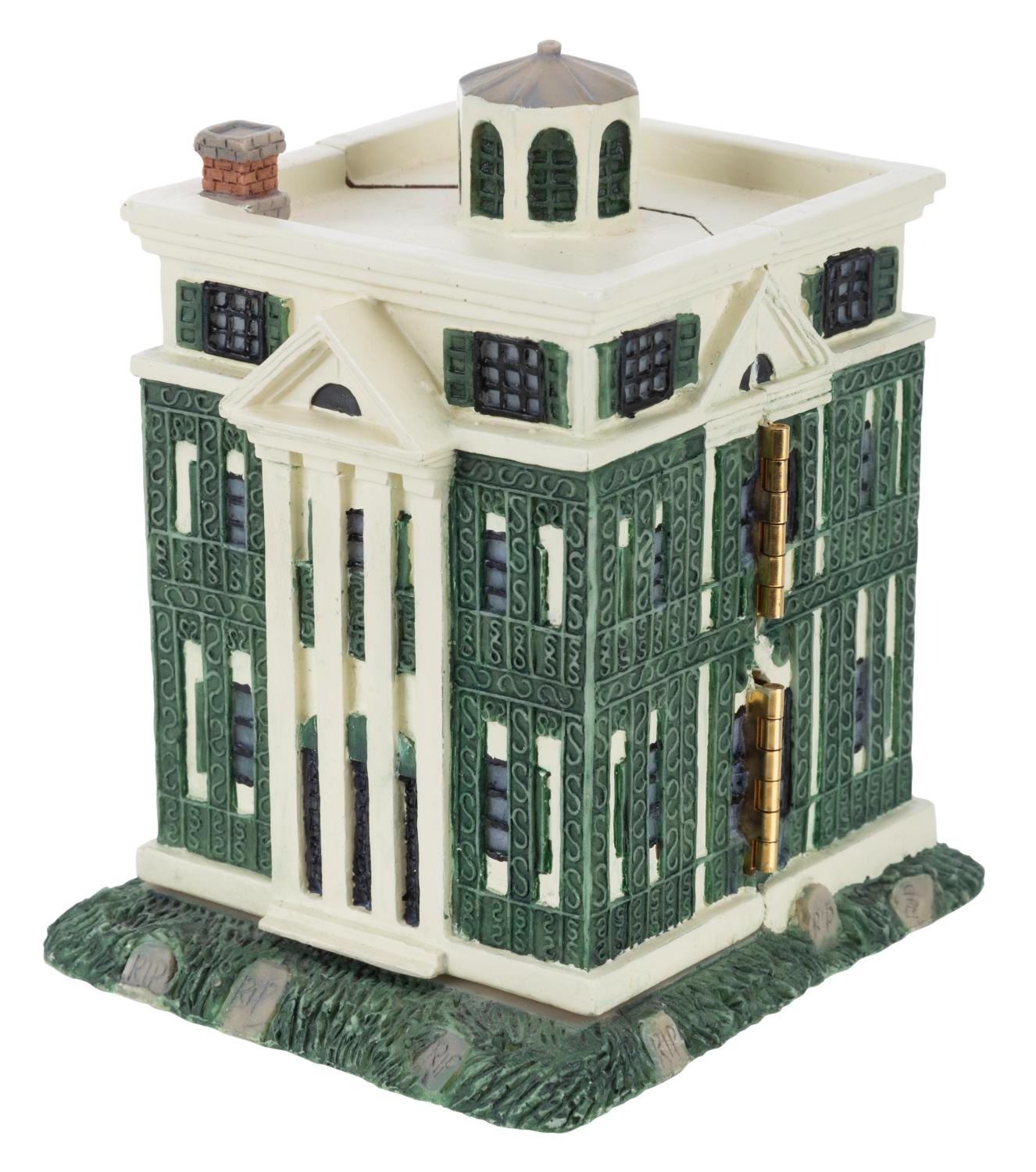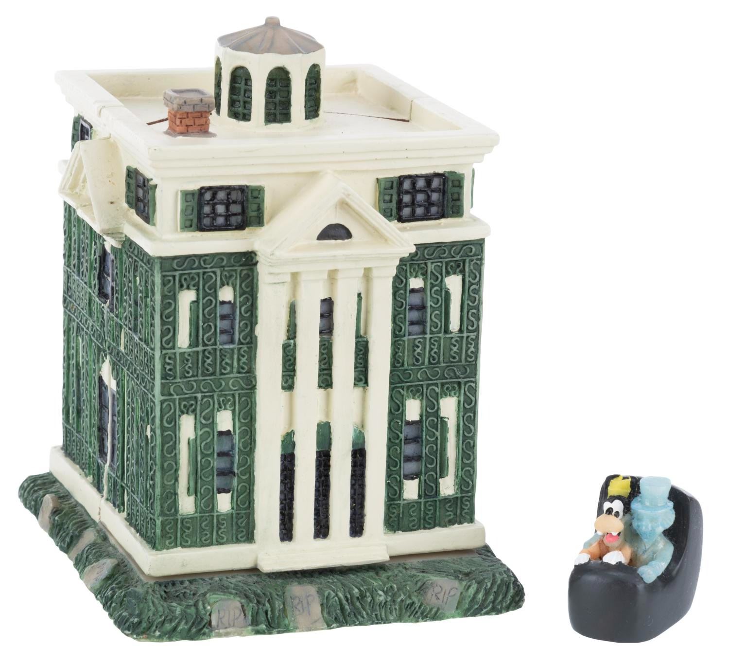 (Disneyland, 1990s) A figural box of The Haunted Mansion that opens to reveal the Hitchhiking Ghosts and Goofy in a Doombuggy. Measuring 3” x 3” x 4” tall, the resin box is in very good condition with light wear.