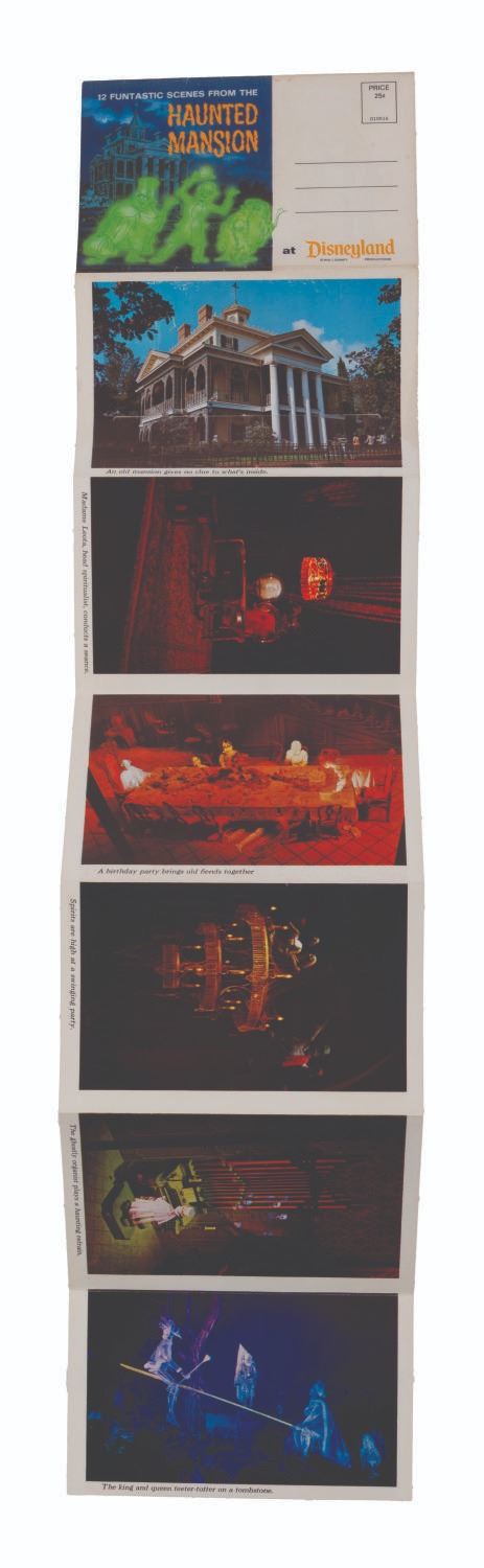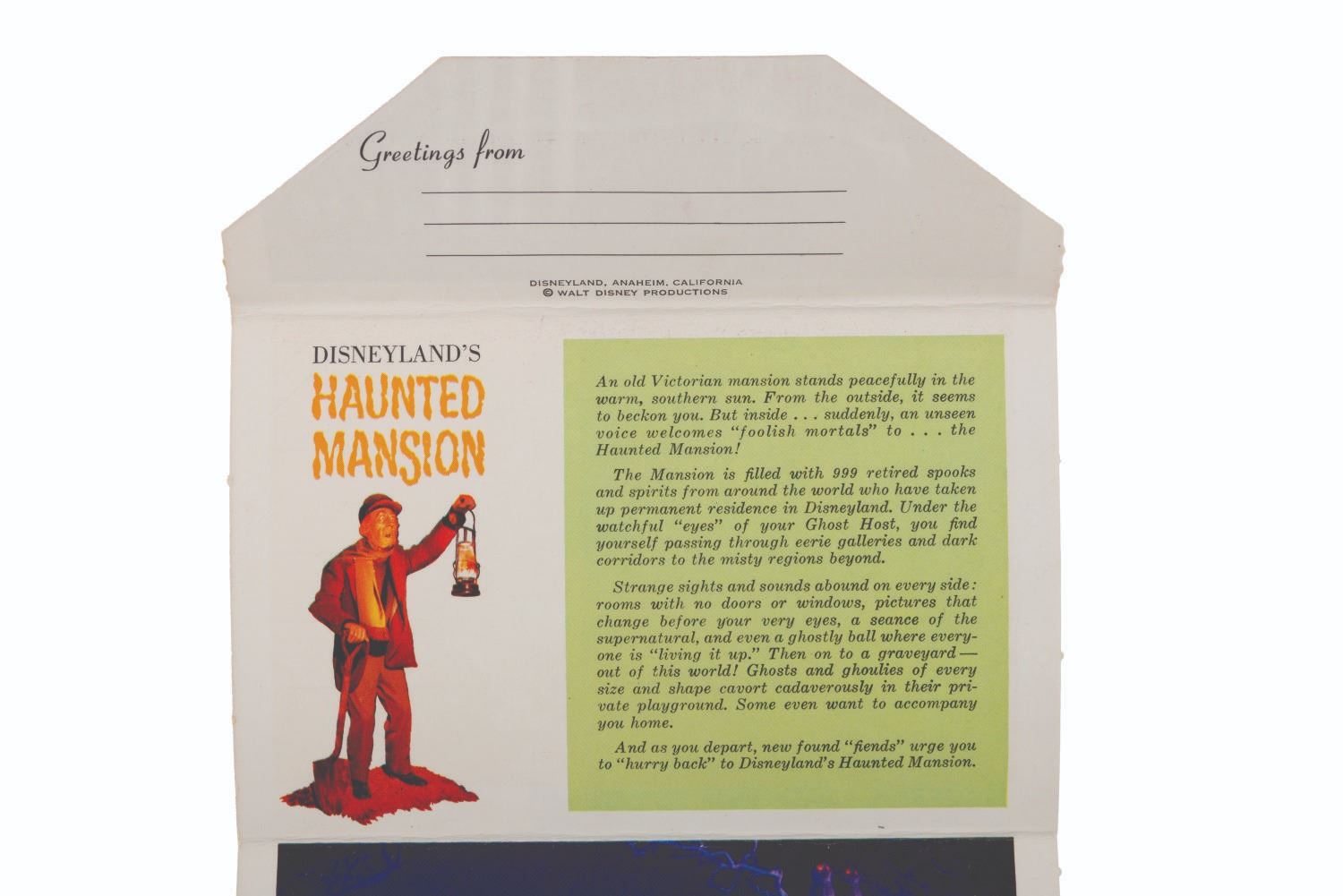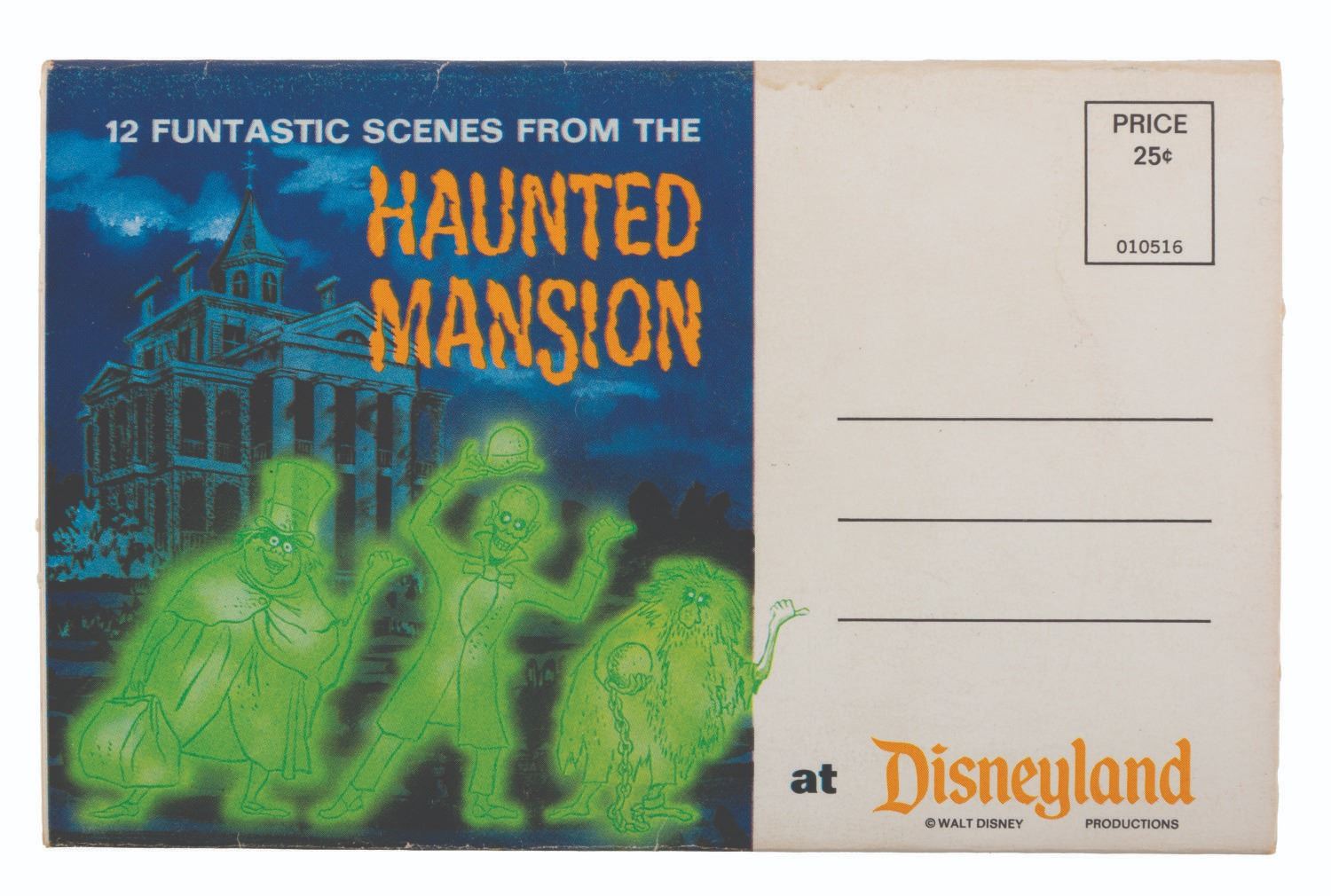 (Disneyland, 1970s) A "12 Funtastic Scenes from The Haunted Mansion " postcard set from the early days of the New Orleans Square attraction. Measuring 4 " x 6.25 ", the postcards display in very good condition with light creases, scratches, a spot of water contact, edge wear, and discoloration from age.