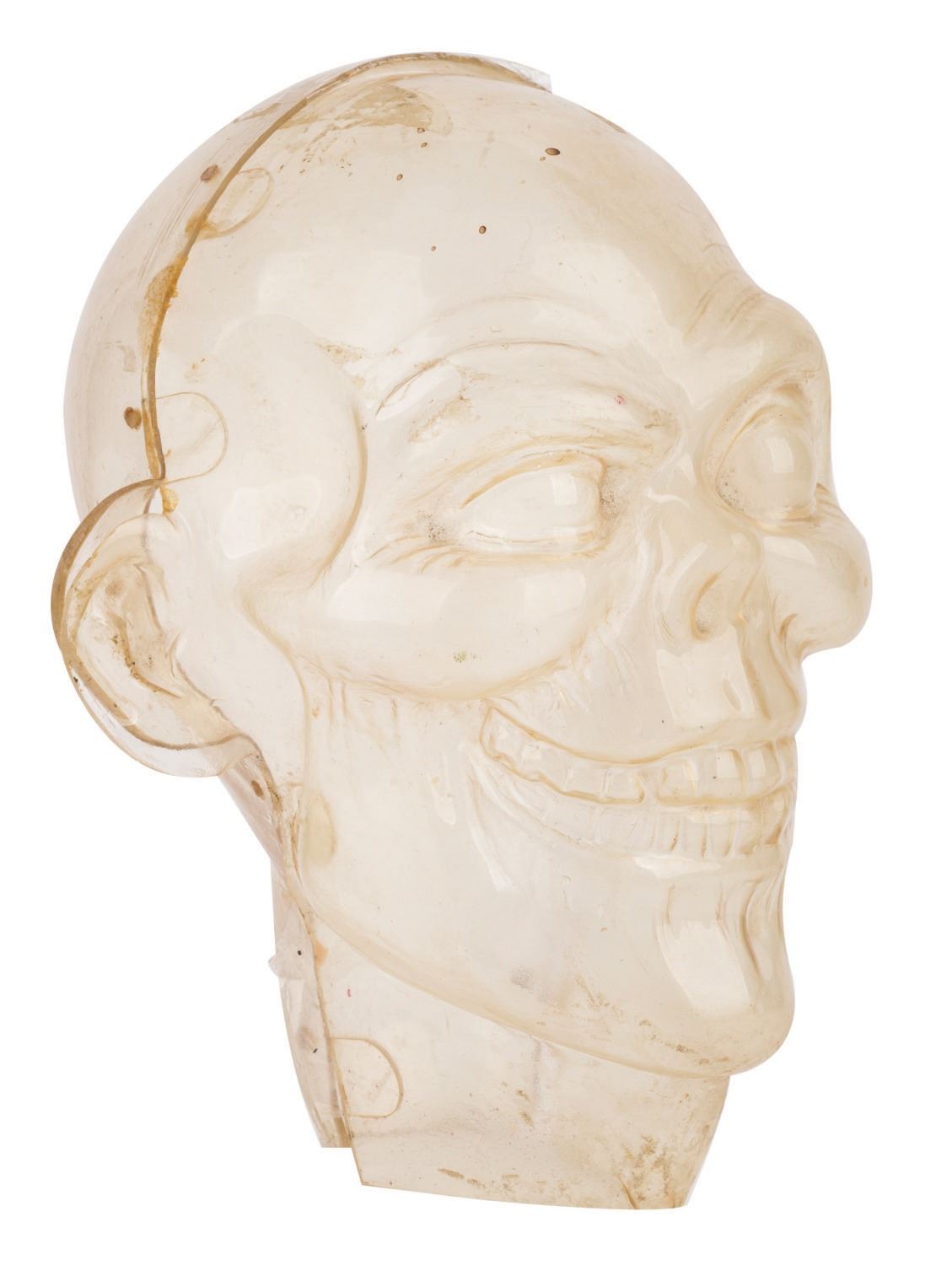 (Walt Disney World, 1971) A head of a figure from the Haunted Mansion at Walt Disney World. The head is the same form used for both the Hatbox Ghost and Hitchhiking Ghost Ezra. The two-part piece is manufactured of a clear vacuum-formed plastic as was used for figures in the graveyard, was fabricated to attach over Audio-Animatronics armature and was removed during a rehabilitation of the attraction. Measuring 10.5" tall and 7.75" at its widest diameter, the head is in good to fair condition, exhibiting considerable wear and discoloration from Park-use.