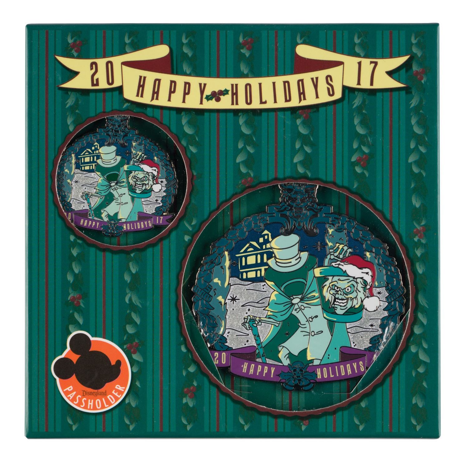 (Disneyland, 2017) A Haunted Mansion "Happy Holidays 2017" boxed pin set created exclusively for Disneyland Passholders. The pin depicts the Hatbox Ghost and Haunted Mansion framed with a wreath and was limited to an edition of 500. Measuring 1.75" and 3", the two unnumbered pins are packaged in their original box, and in fine condition.