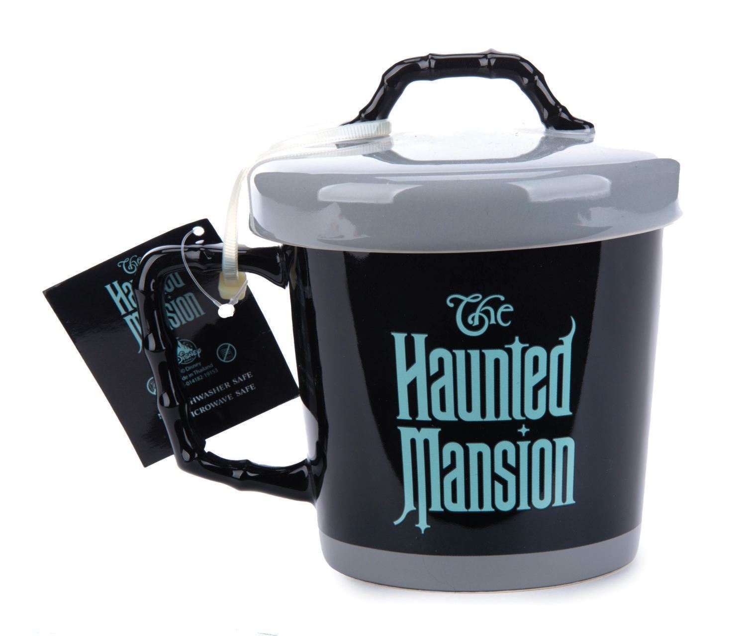 (Disney Parks) A Haunted Mansion Hatbox Ghost Mug. The (2) piece mug comes with a lid, is heat sensitive and features disappearing and reappearing imagery of the Hatbox Ghost's head on one side. Measuring 5.5" tall and 5.5" at its widest diameter, the mug is in fine unused condition with original instruction tags.