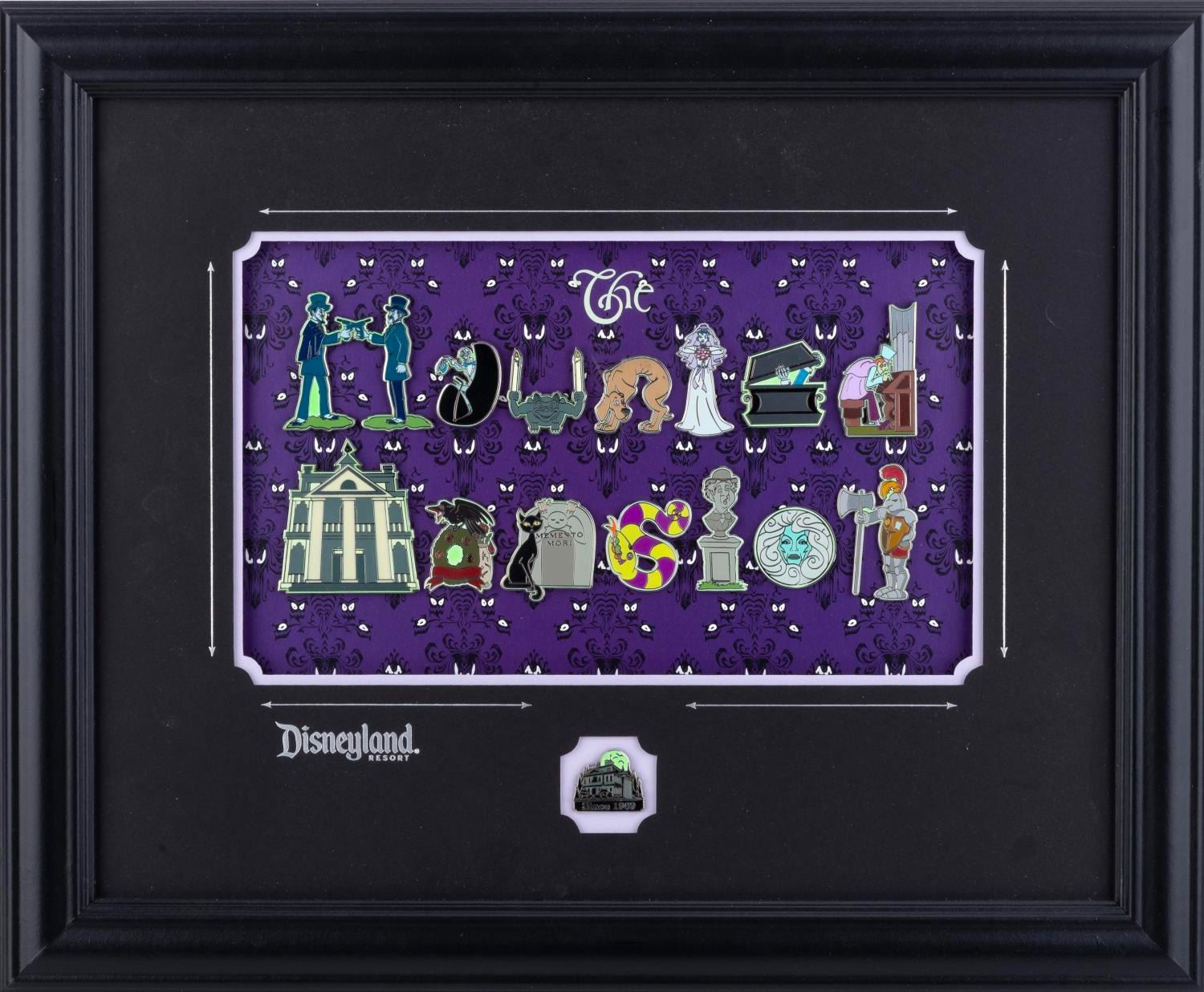 (Disneyland, 2009) A "Haunting Spells" framed fifteen pin set by Monty Maldovan, spelling out "Haunted Mansion," with a fifteenth "completer" pin of the Mansion itself. Measuring 15.5"x12.75", the set is in fine condition.