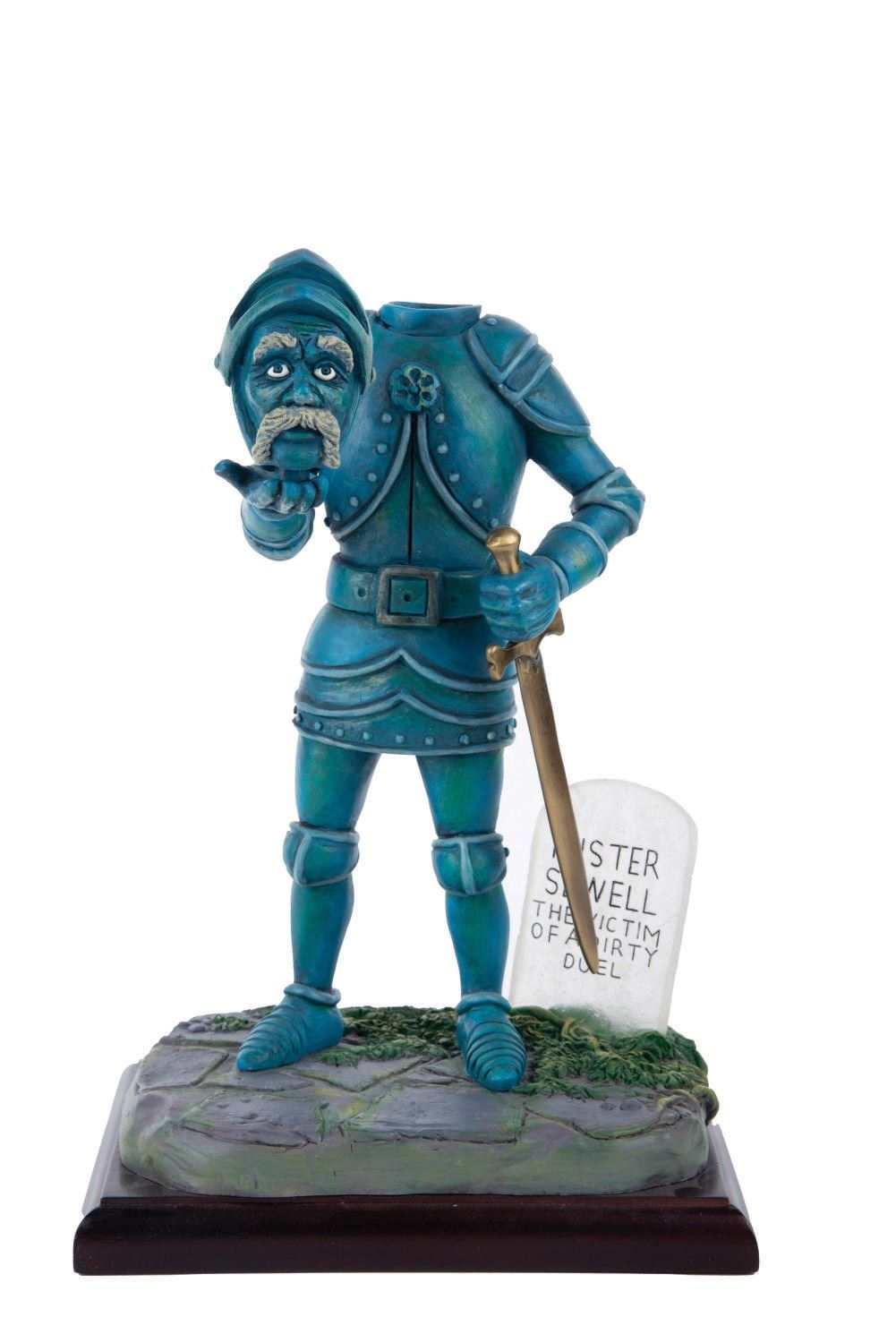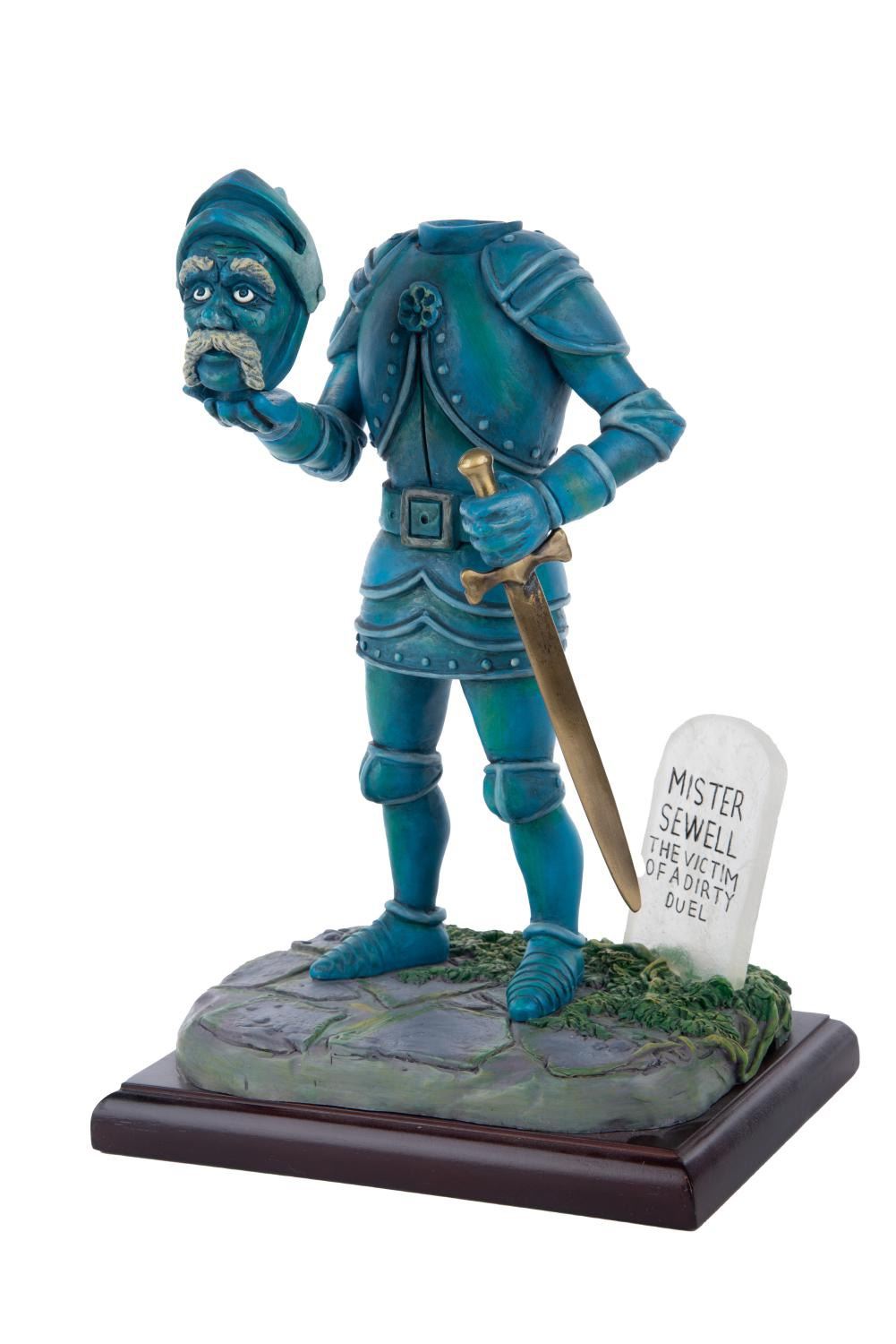 (Walt Disney World, 2004) A light-up figure of Headless Sewell of The Haunted Mansion at Disney Parks. The figure of the decapitated knight was designed by artist Randy Noble and once available in an edition of 400 through "999 Happy Haunts: A Ghoulish Gathering" at The Magic Kingdom. The figure requires (3) AAA batteries (not included). Measuring 11.75" tall and 8"x6", the figure is in fine, working condition.