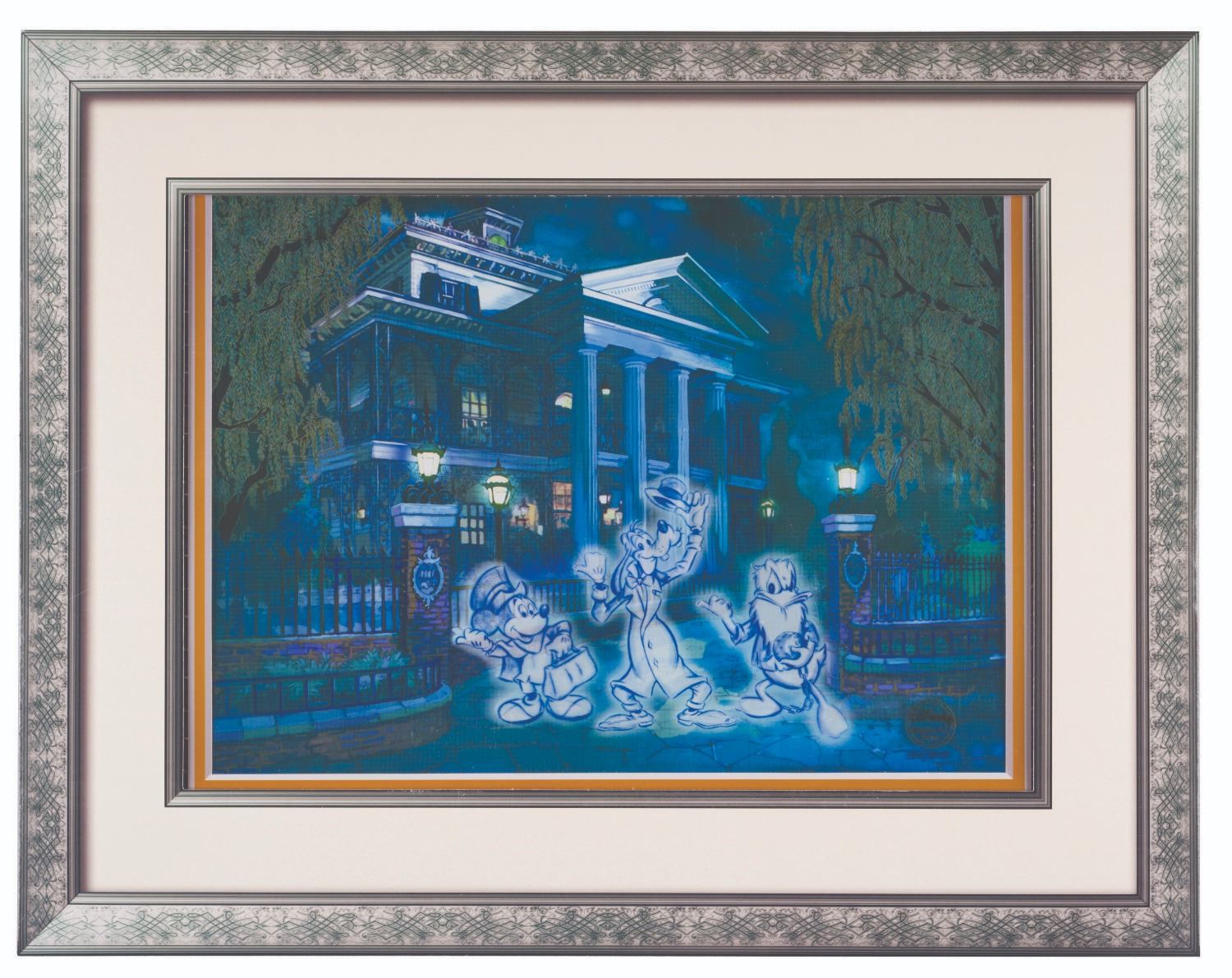 (Acme Archives, 2009) A Haunted Mansion Hidden Image cel featuring 13 Haunted Mansion icons hidden in an image of Mickey, Goofy, and Donald as the Hitchhiking Ghosts. This piece was designed by Artist David Sourwinein and has been numbered 194/1000. The piece has an image size of 11.75"x8" and is in fine condition in its original matte and 17.5"x13.5" decorative window envelope.