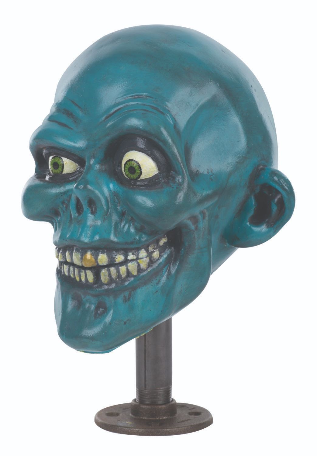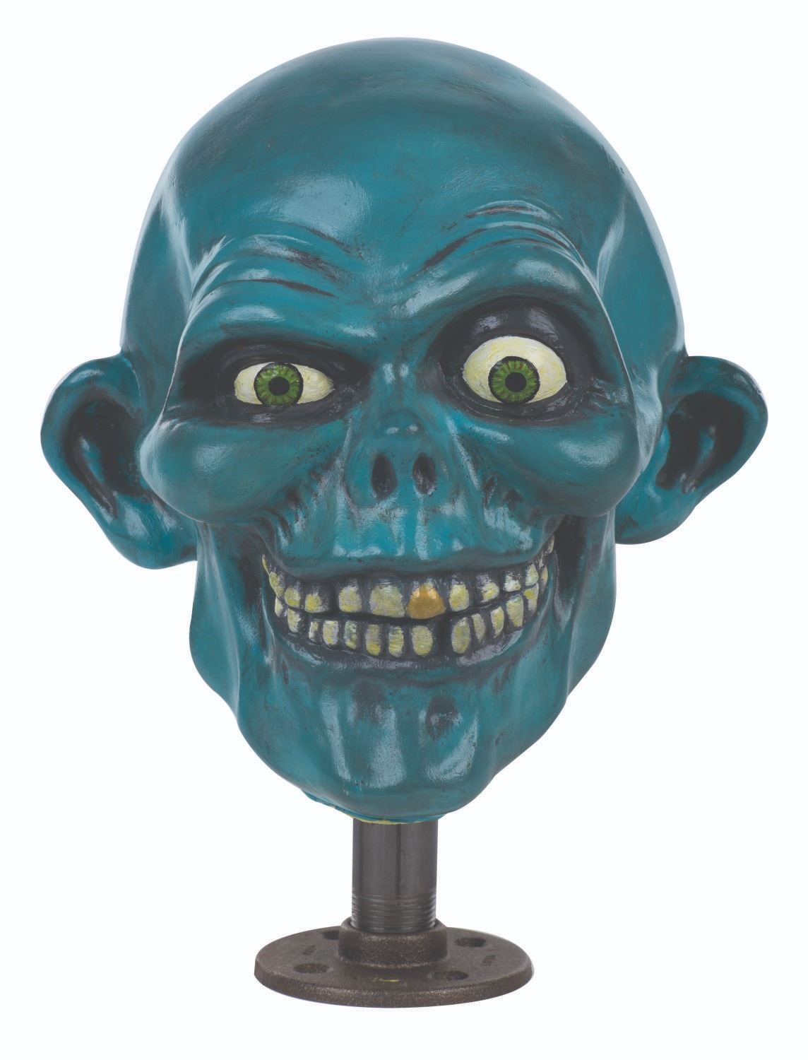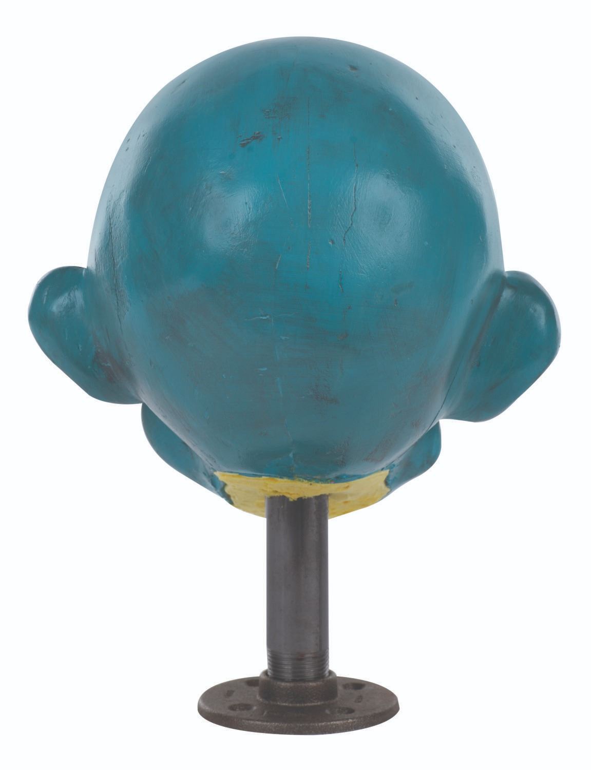(Disney) A replica of the Ezra / Hatbox Ghost head from The Haunted Mansion. The sturdy resin recreation is foam-filled and hand-painted. Measuring 9" tall and 8.5" in diameter, the head is mounted on a metal pipe for a complete height of 11.5". The piece displays in very good condition despite slight wear from handling and a 3” hairline crack behind the right ear.