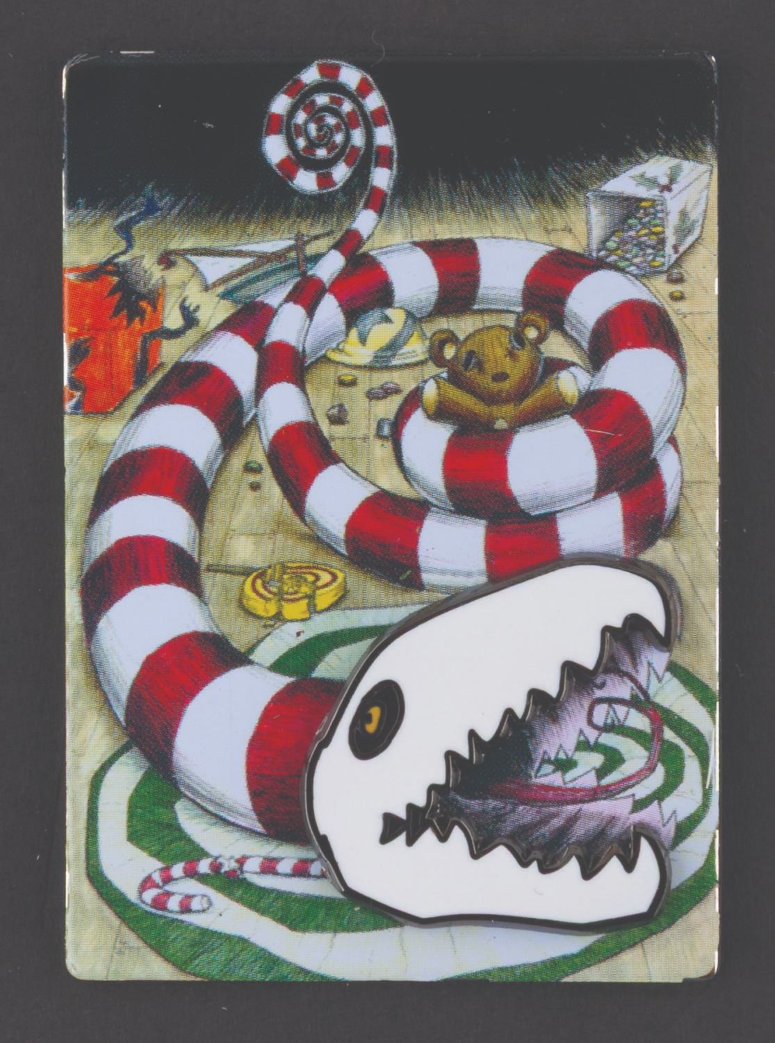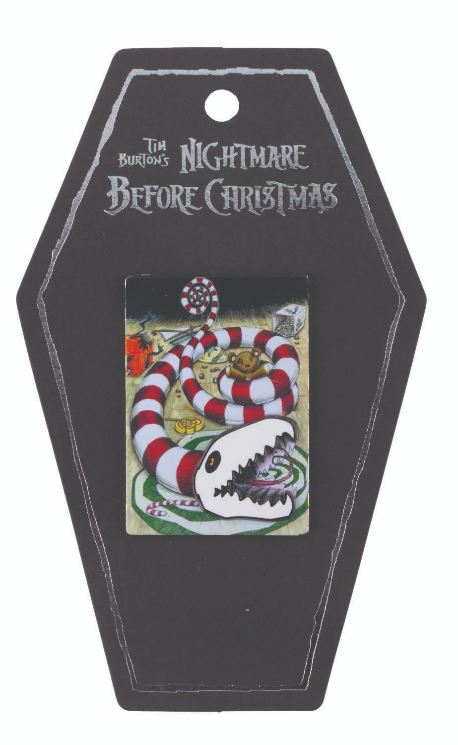 (Disneyland, 2001) A Haunted Mansion Holiday pin of the Candy Cane Snake stretching portrait in the"Tim Burton's The Nightmare Before Christmas” inspired overlay of the attraction. The pin was the second in a series of four released in 2001, the year the overlay debuted, and was based on artwork by Tim Wollweber and Sheri Lundberg. Measuring 1.5” x 2.25” on the original 3.5” x 5.75” coffin-shaped backing card, the pin is in good condition with a light nick, one of the posts on the reverse broken off but included, and light edge wear to the card.