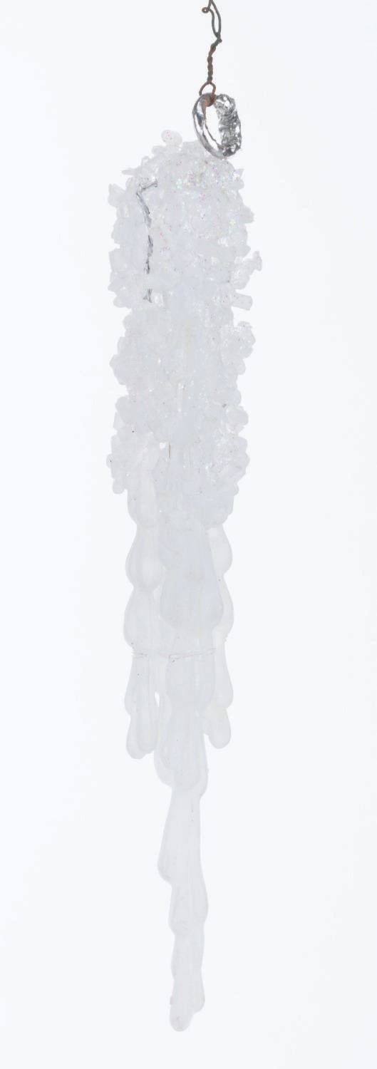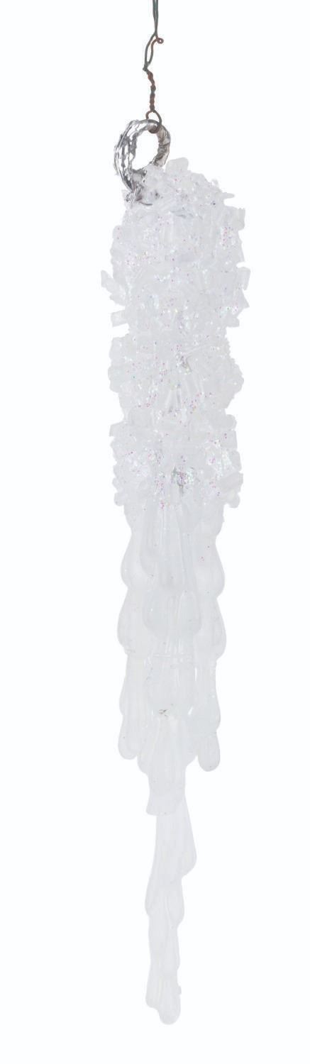 (Disneyland, 2020s) An icicle prop used in the Haunted Mansion Holiday seasonal overlay at Disneyland. Hundreds of decorations are added to the Mansion each year, including dozens of these icicles, seen on trees throughout the cemetery. The acrylic prop icicle measures 6" long with a metal ring at the top. The prop is in very good Park-used condition.