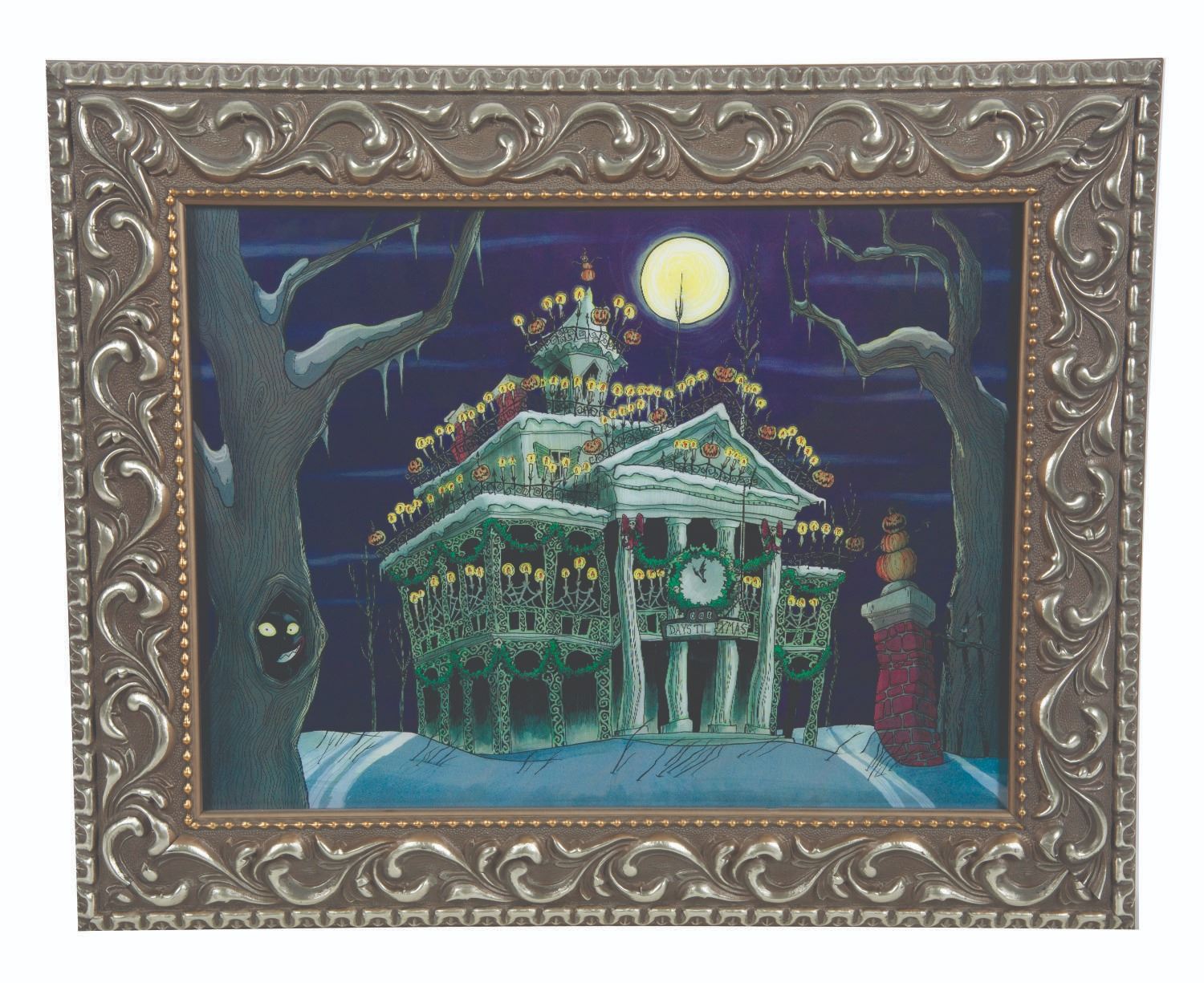 (Disney) A Haunted Mansion Holiday Lenticular Portrait. This piece measures 16.5”x19.25”, is inspired by the popular Disney Parks winter seasonal overlay of the attraction, and is in very good condition with minor wear to the frame.