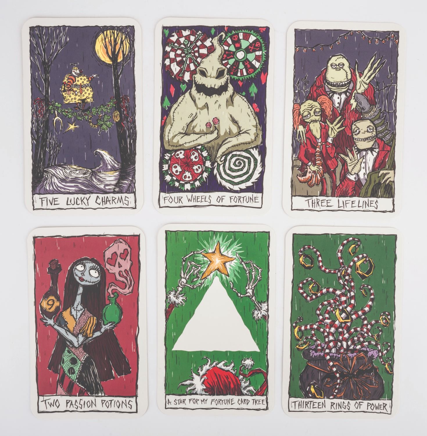 (Disneyland, 2001) A rare set of tarot cards from the debut of Haunted Mansion Holiday. Guests riding through the seasonal overlay for the first time were given this 26-card set reproducing the tarot cards seen in Madame Leota's séance room. Measuring 4.5"x7.25", this set is in very good condition with wear to the box.