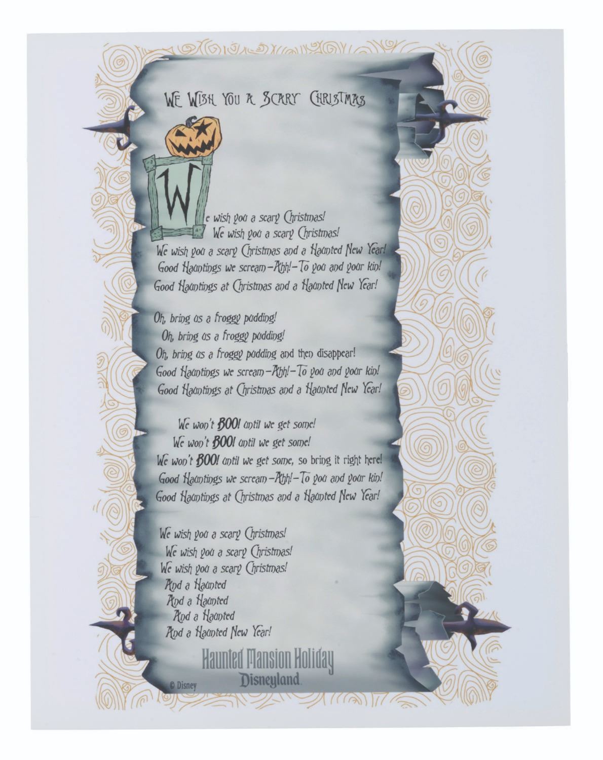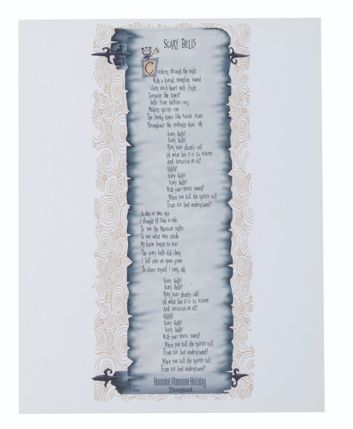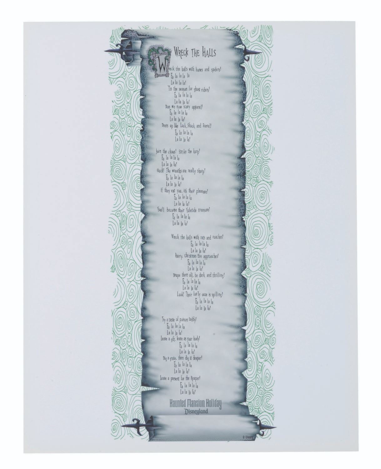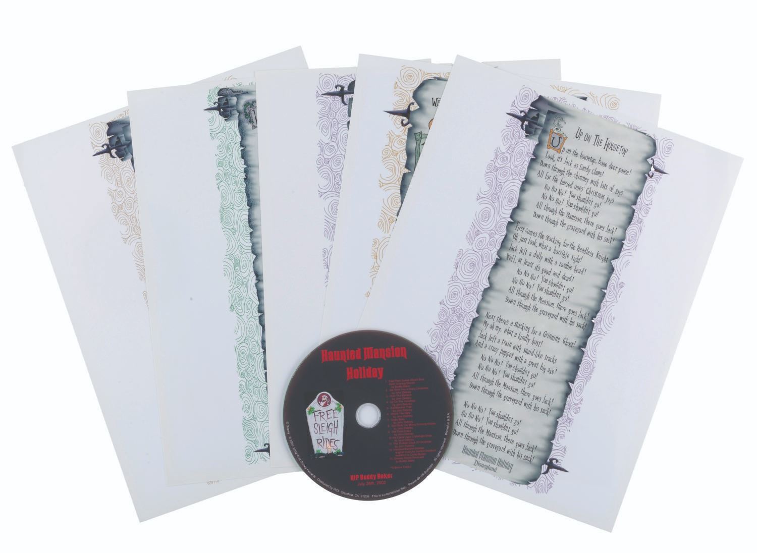 (Disneyland, 2002) A CD with 13 tracks from the Haunted Mansion featuring 10"Scarols” played during the Haunted Mansion Holiday, with five prints of lyrics. These were gifted to attendees of the opening event for the seasonal overlay in 2002. The CD and prints are in very good condition.