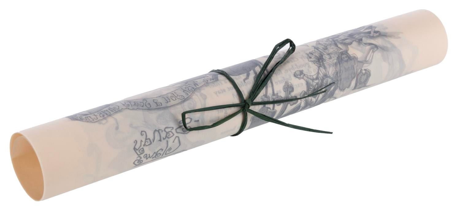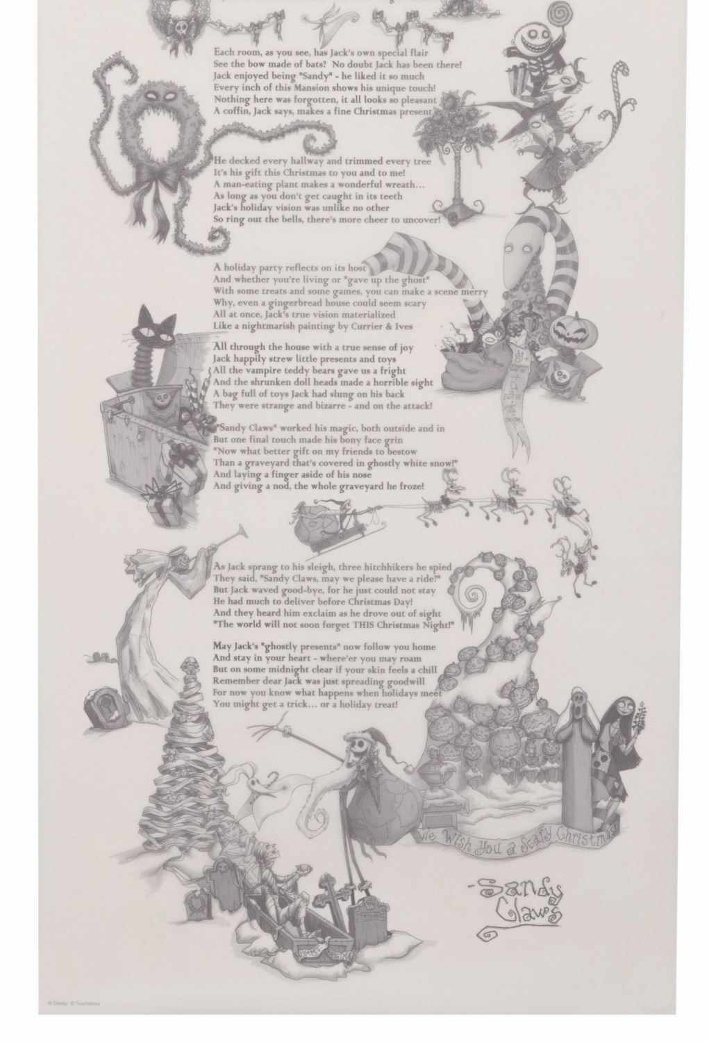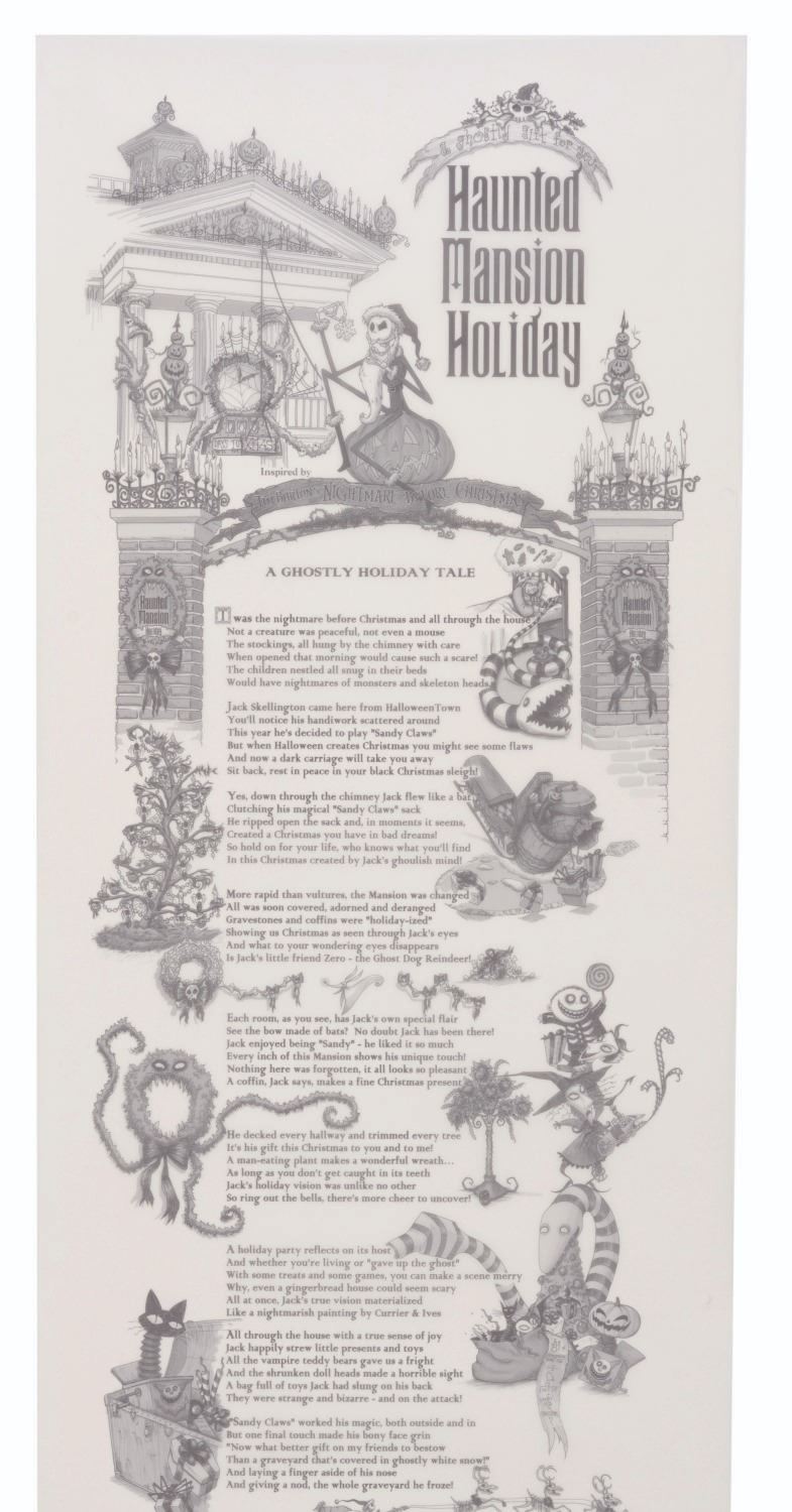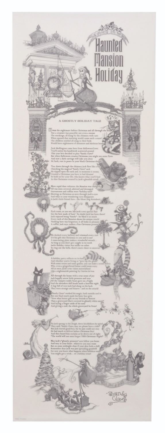 (Disneyland, 2001) A Haunted Mansion Holiday Souvenir Poster. The piece was released during the first year of the winter season overlay of the Haunted Mansion, featuring the twisted version of the Night Before Christmas poem created for this attraction and heard from the narrator while riding. The poem is presented alongside striking art of the Nightmare Before Christmas characters within the Mansion. Measuring 12"x36", this souvenir poster is in fine condition, tied in a black bow and stored in the 3"x13.25" tube it originally came in.