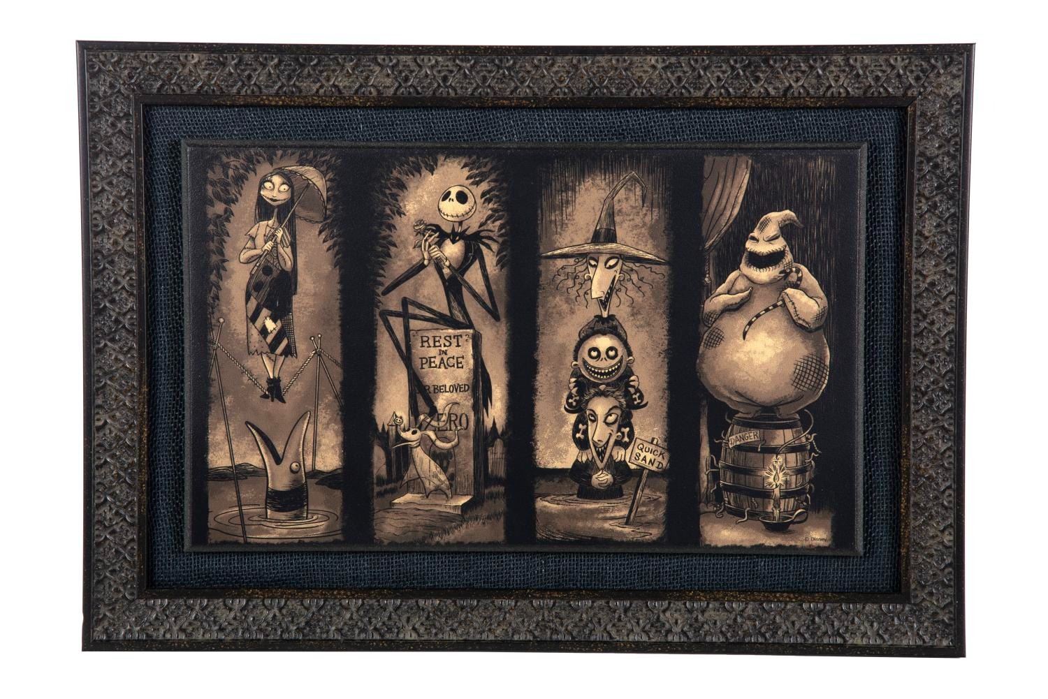 (Disney Parks) A Haunted Mansion Holiday Stretching Portraits mixed-media artwork inspired by "Tim Burton's The Nightmare Before Christmas" and the seasonal Haunted Mansion overlay. Accomplished on composite wood and mounted within a 20.5" x 14.25” frame, the piece is in fine condition.