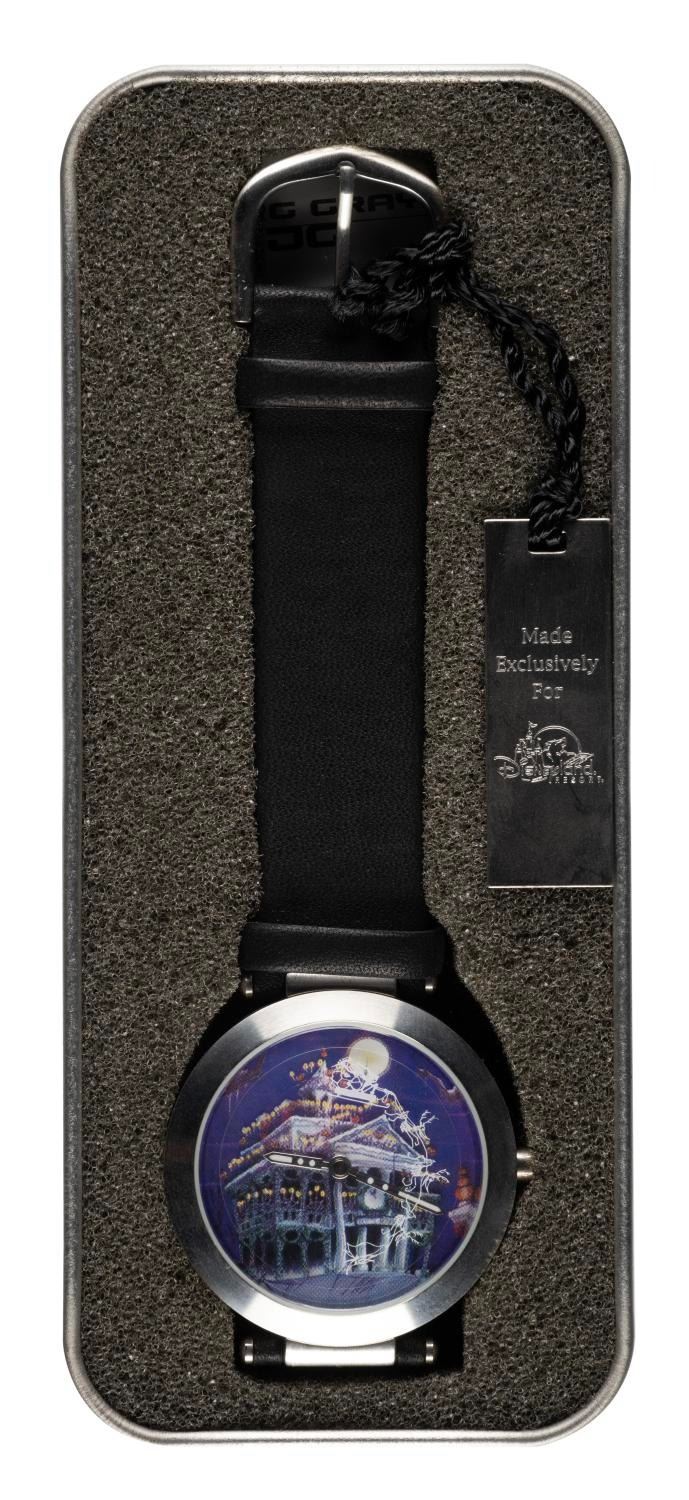 (Disneyland, 2000s) A Haunted Mansion Holiday Watch, with a face featuring the Mansion exterior, and a second-hand of Jack Skellington's sleigh pulled by skeleton reindeer. Measuring 1.5" in diameter with a 9" band, this timepiece is in fine condition in its original tin box.