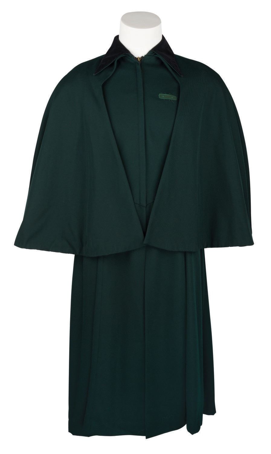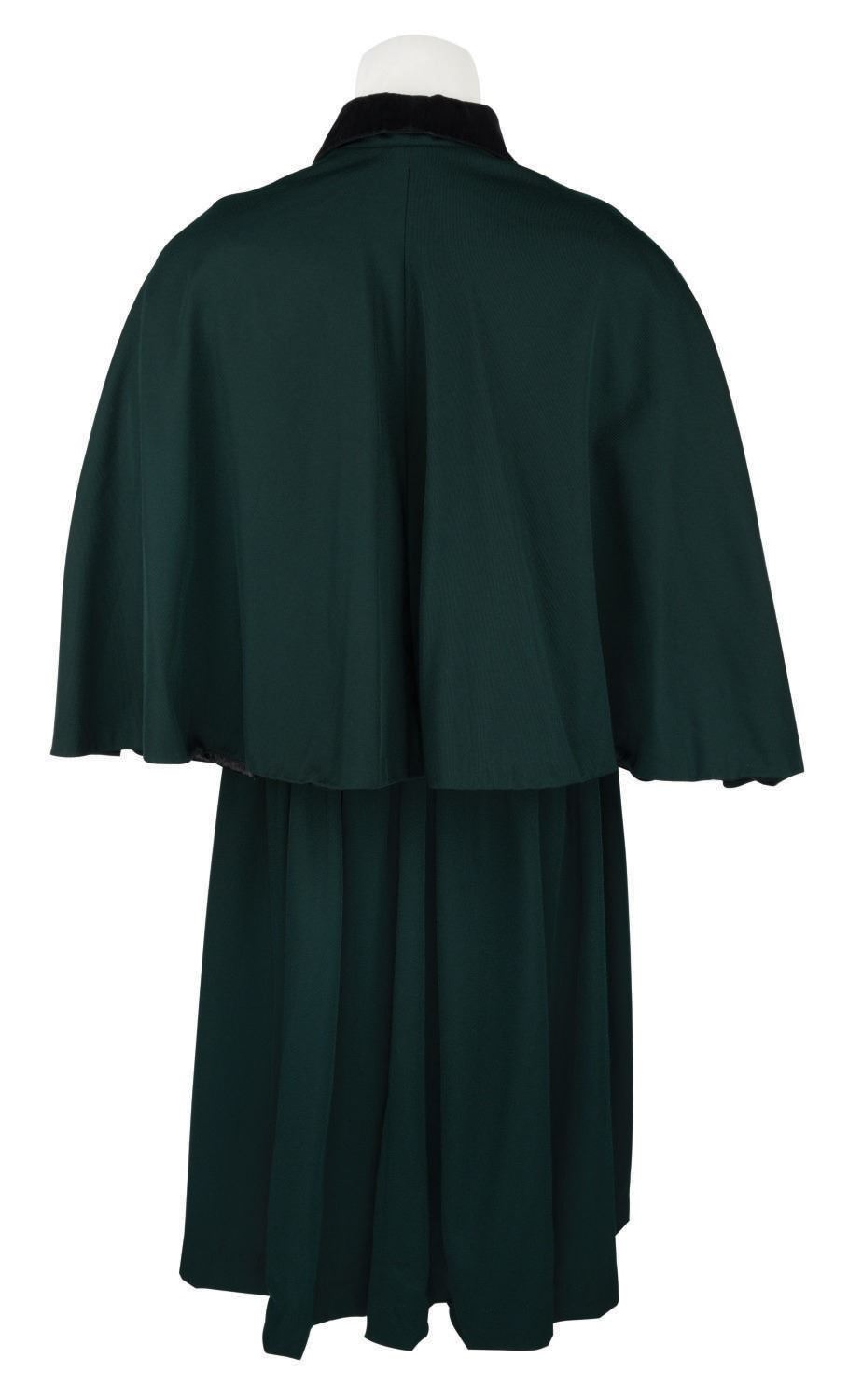 (Walt Disney World, 2000s) A Haunted Mansion Hostess costume with cape from the Liberty Square in The Magic Kingdom at Walt Disney World. The costume comes with a cape for cold-weather days of Park operation. Measuring various sizes, each piece in very good Park-used condition with wear from Park-use, handling, and age.
