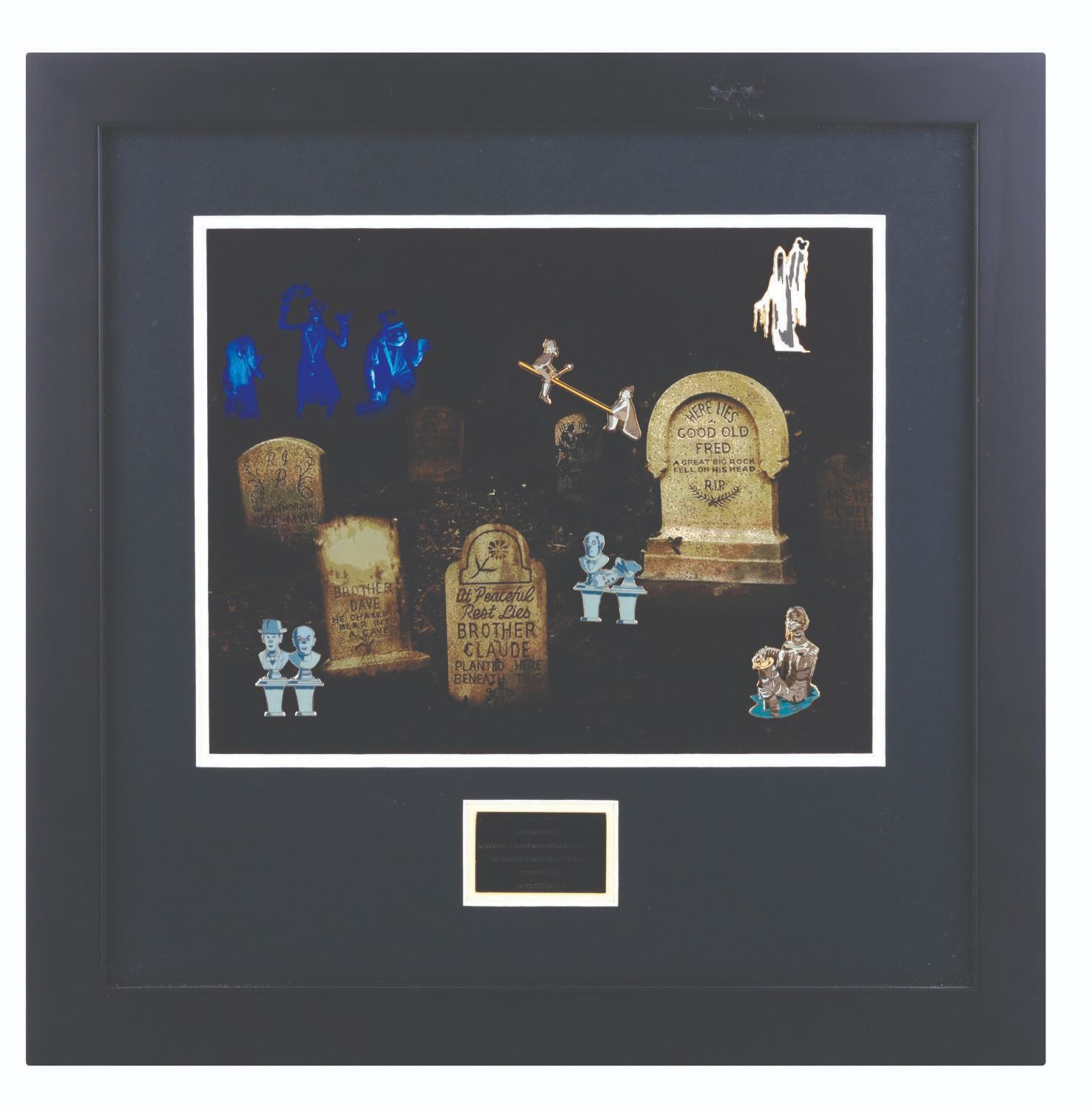 (Walt Disney World, 2003) A Haunted Mansion “Laid To Rest” Framed Pin Set. This set was designed by Disney Artists Mark Seppala, Randy Noble, and Michelle Morrow, and was released in an edition size of 25 at The Magic Kingdom on October 29, 2003. This set includes (5) pins including the Singing Busts, the Mummy, King & Queen, and Crypt Ghost (with hidden Mickey). Measuring 15.5”x15.5”, the pins are in fine condition, with faint scuffs on the top edge of the frame, and Certificate of Verification.