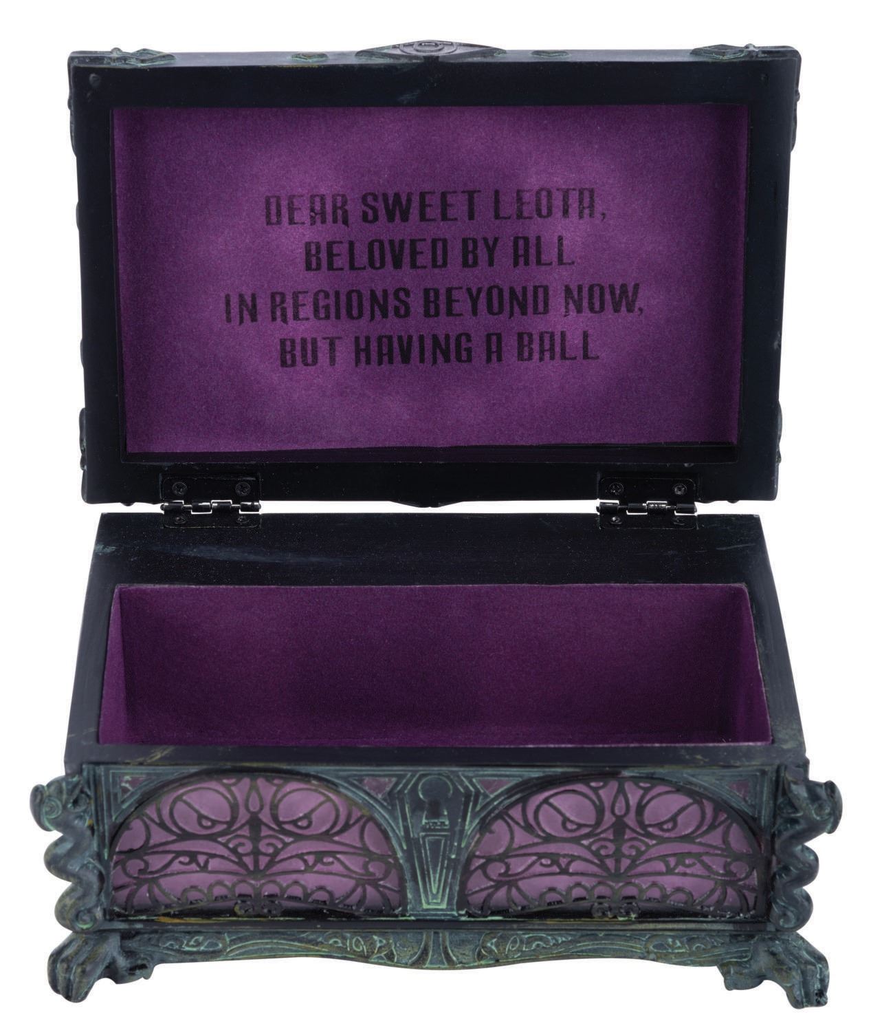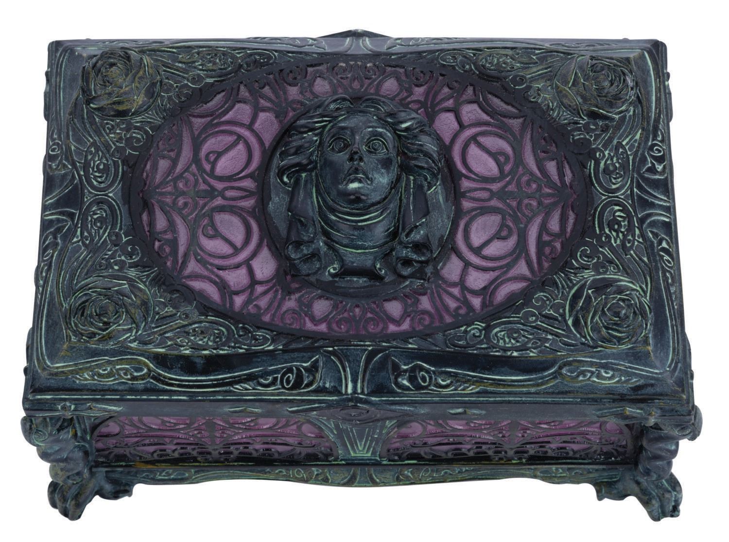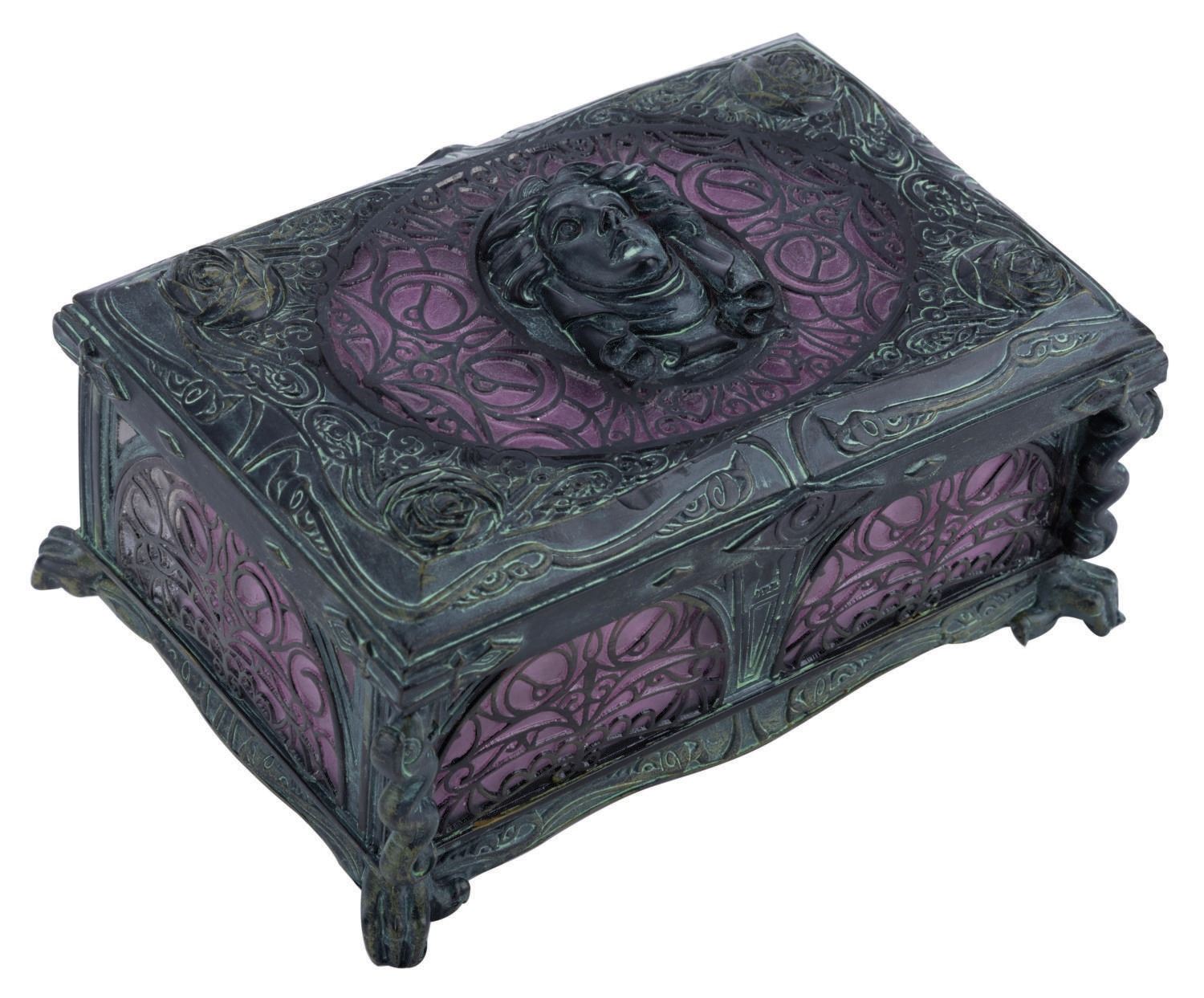 (Disneyland, 2014) A Haunted Mansion Madame Leota Jewelry Box. The wind-up musical jewelry box plays a portion of the Grim Grinning Ghosts theme from the Haunted Mansion and features relief of Madame Leota's tombstone with epitaph inside. Measuring 6.5"x4.75" and 3.5" tall, the box is in very good condition, with minor wear from handling, and retaining its Disney Parks product tags.