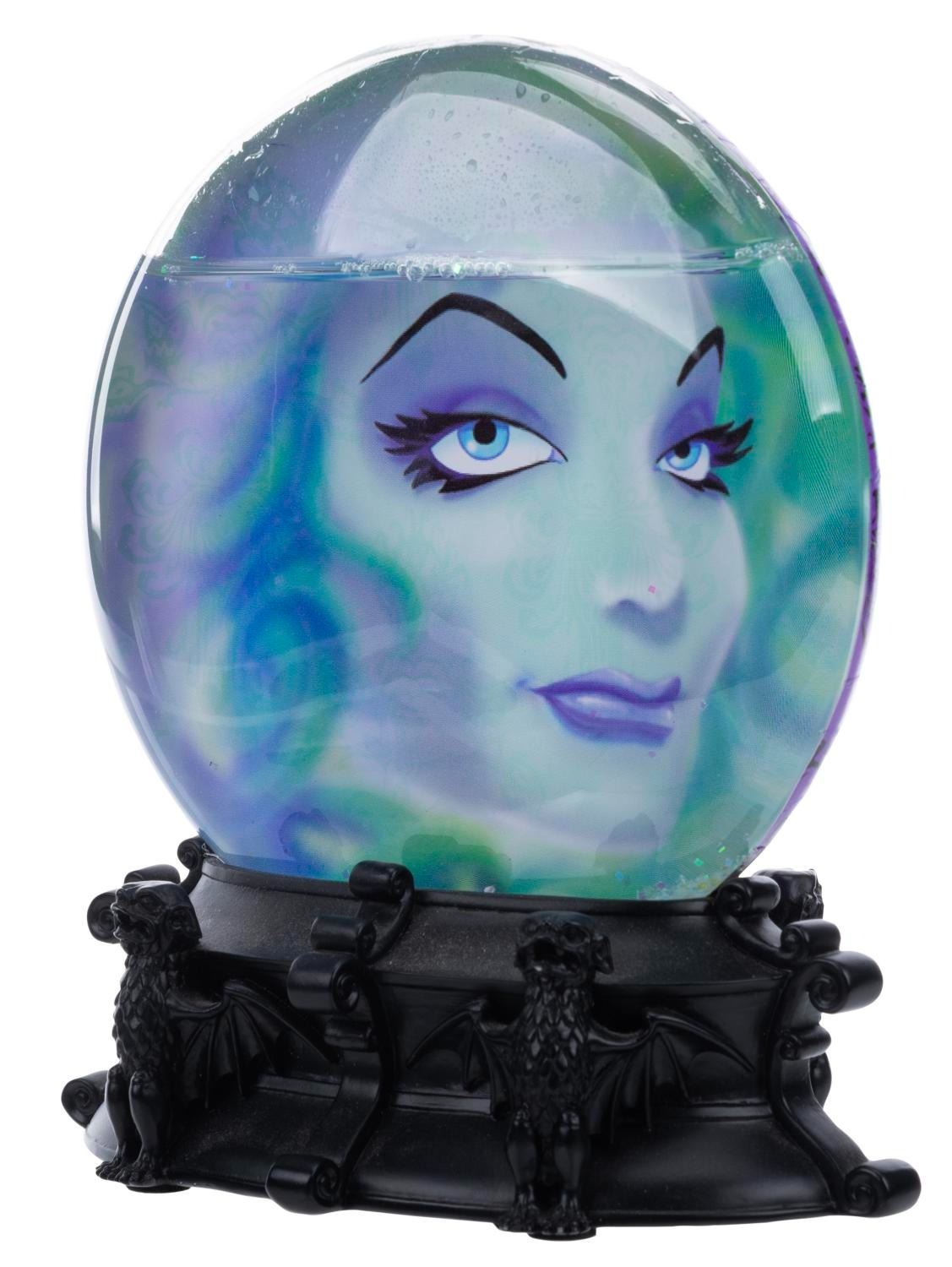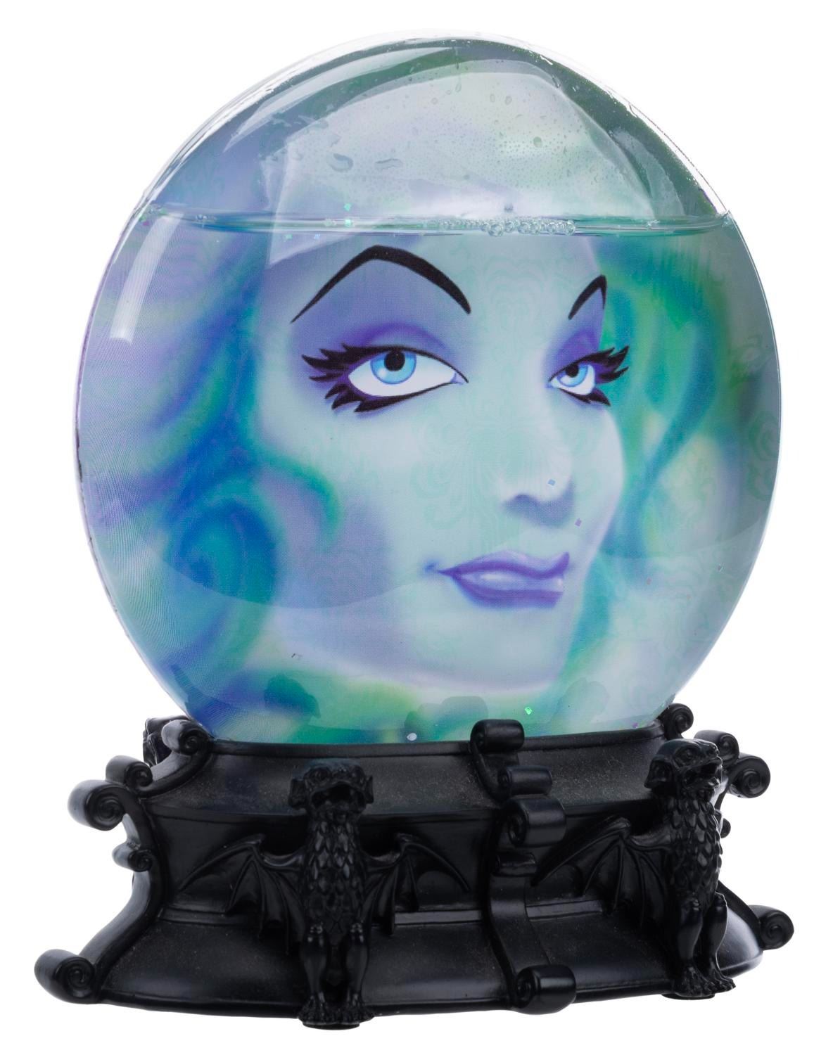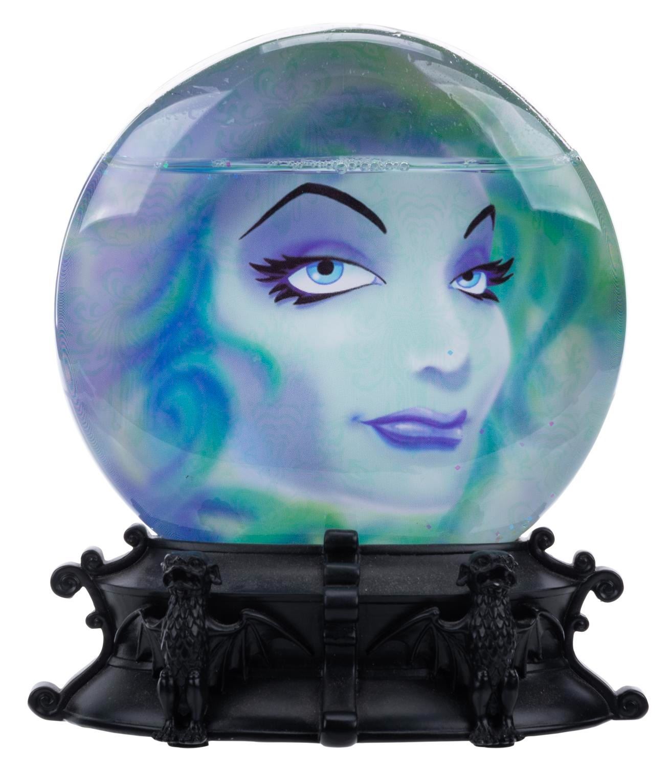 (Disney, 2000s) A Madame Leota snow globe with a bat stanchion-themed base and a Haunted Mansion wallpaper pattern on the reverse. The globe’s light-up function requires three 1.5V batteries (not included) and did not work when tested. Measuring 5.5” x 3” x 6” tall, the globe displays in very good condition with scratches, scuffs, and wear.