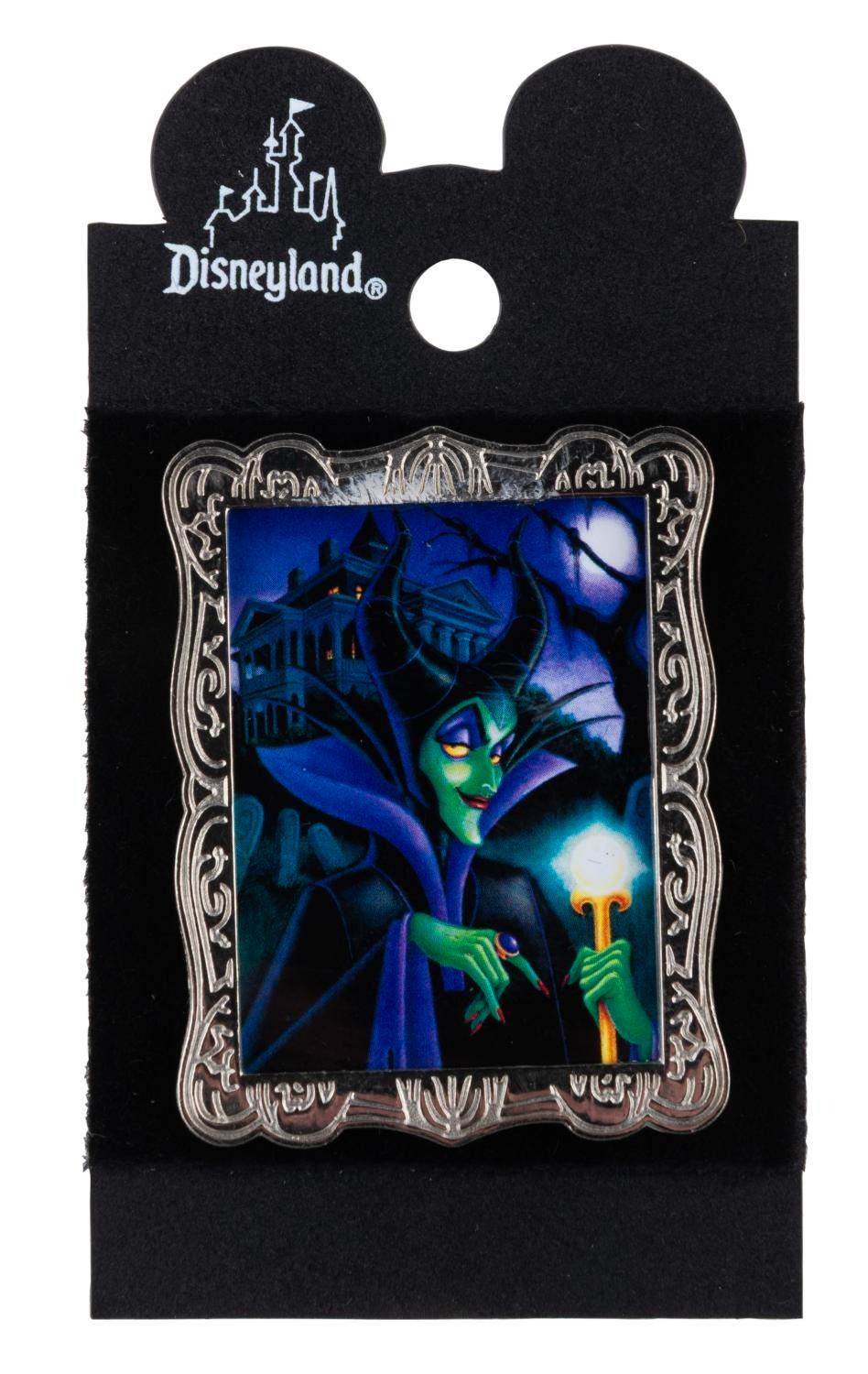 (Disneyland, 2000) An October 2000 Character of the Month pin of Maleficent standing in front of the Haunted Mansion. Measuring 1.5" x 2", the pin is in fine condition on the original card.
