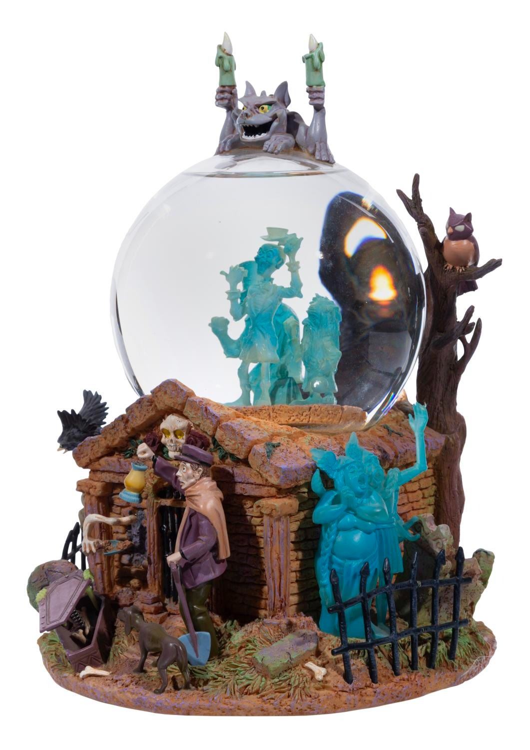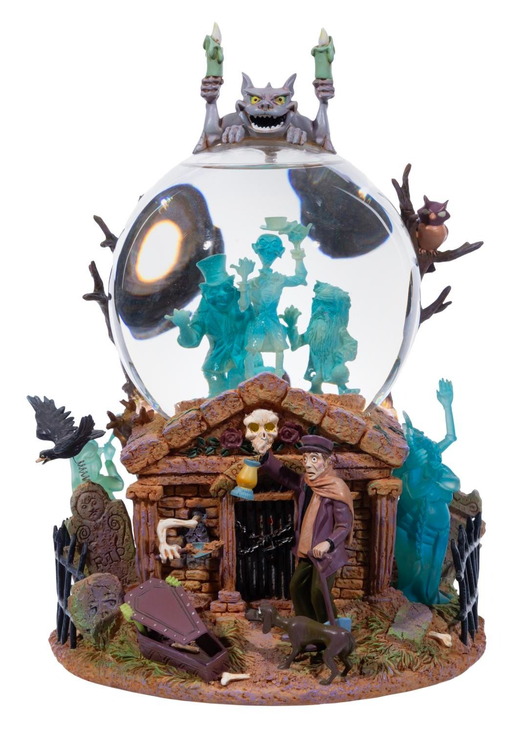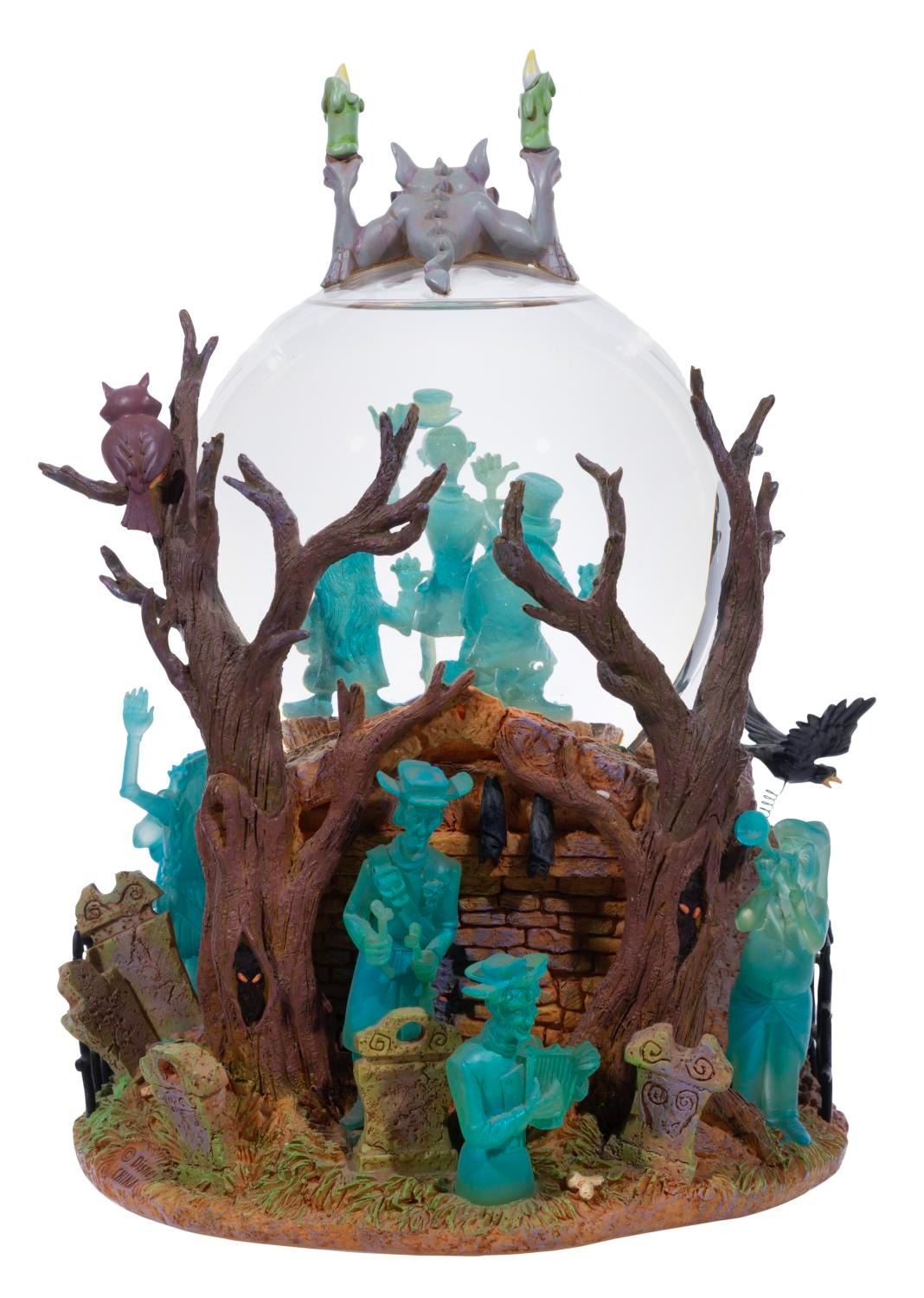 (Disneyland, 1990s) A snow globe featuring the Caretaker, Hitchhiking Ghosts, and Graveyard Ghosts from the Haunted Mansion. When wound, the musical feature plays "Grim Grinning Ghosts" and the ghosts around the base illuminate with the help of (2) AAA batteries (not included). Measuring approximately 9.5" tall, the snow globe is in fine working condition.