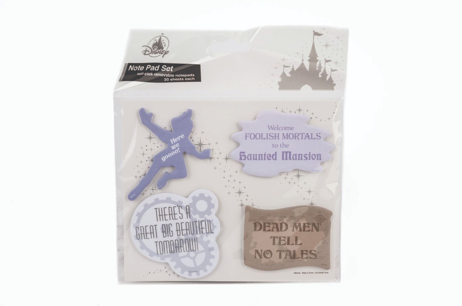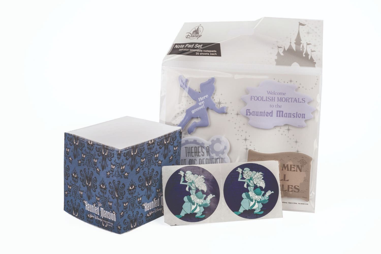 (Walt Disney Imagineering) A Walt Disney Imagineering Haunted Mansion notepad, four-pack of note pads, and Hitchhiking Ghost stickers. This set is in fine condition.