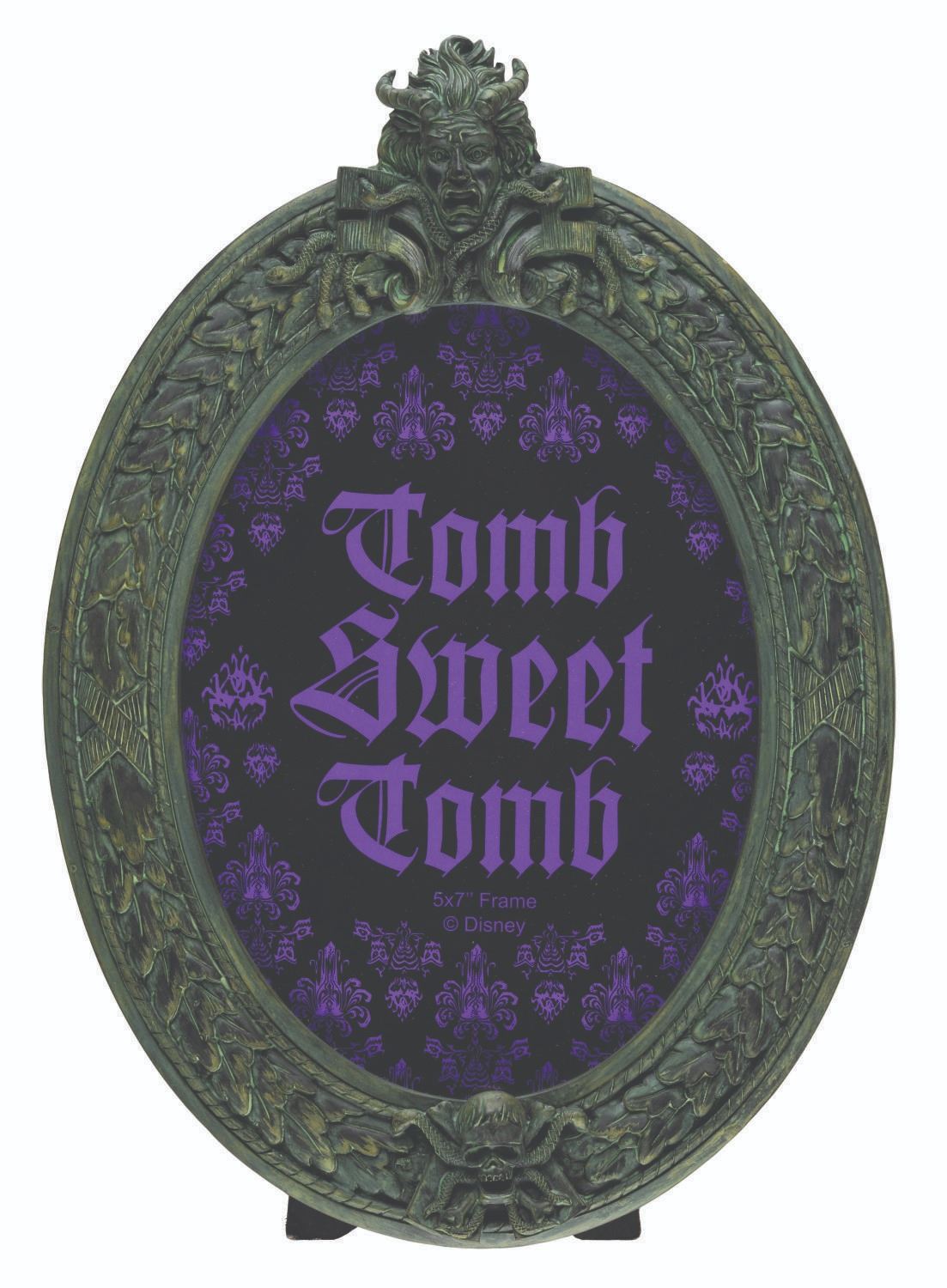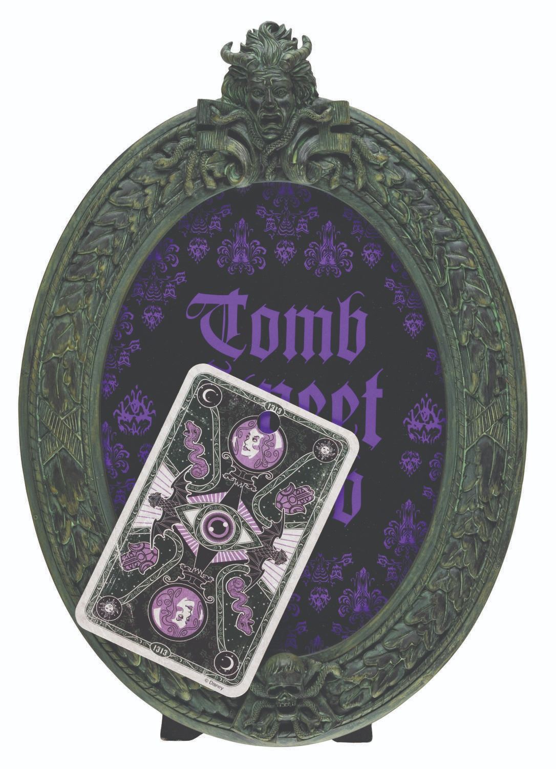 (Disneyland, 2000s) An oval Haunted Mansion picture frame with space for a 5" x 7" photo. Its original tarot card-inspired tag is detached and included. Measuring 7" x 10" total, the frame is in very good condition with light wear.
