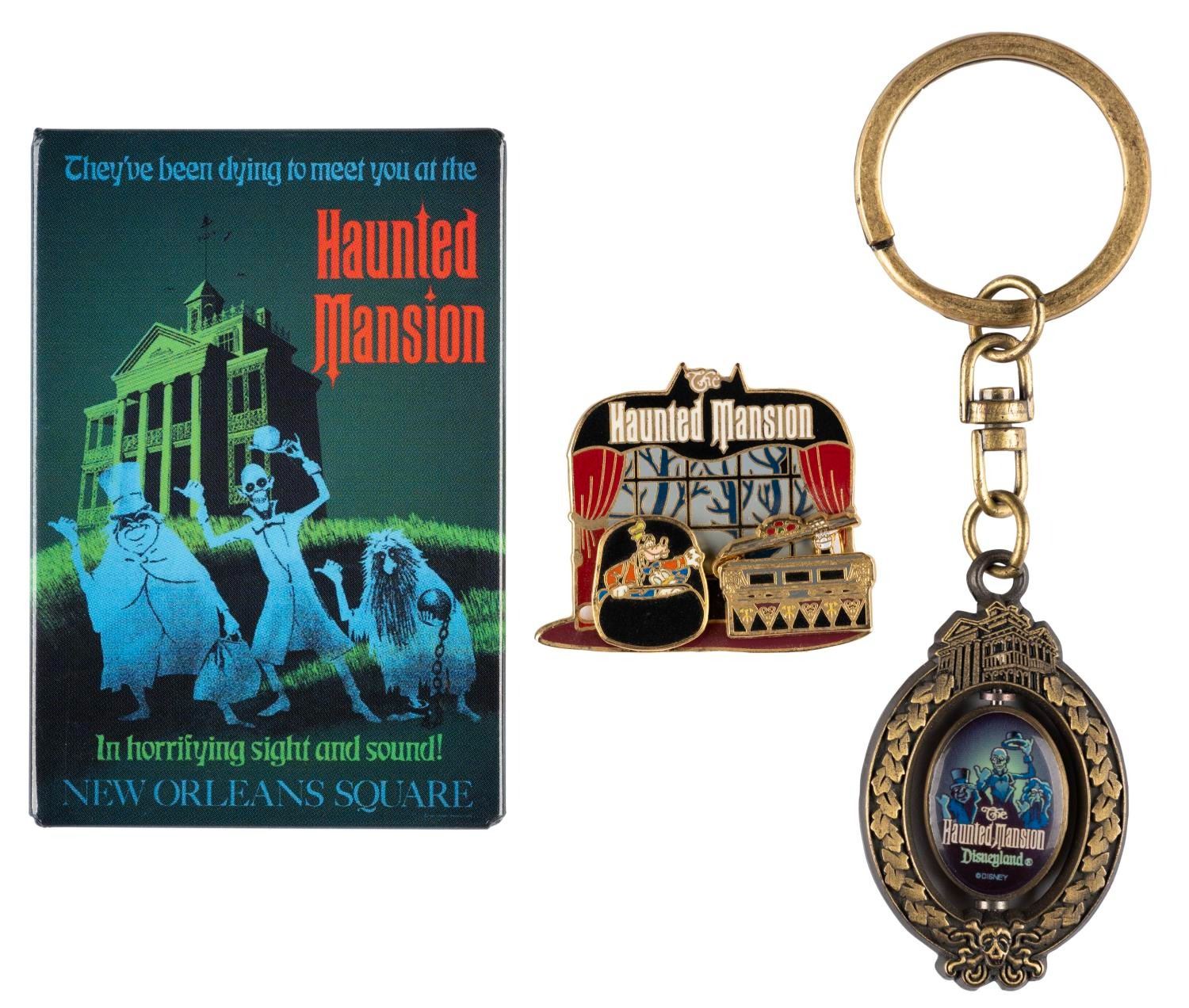(Disneyland, 2000s) A collection of Haunted Mansion souvenirs including an attraction poster magnet, a keychain with spinner feature, and a 2002 pin featuring Goofy and Donald in a doom buggy with a moving coffin lid. The collectibles are in very good condition with light handling wear to the pin.