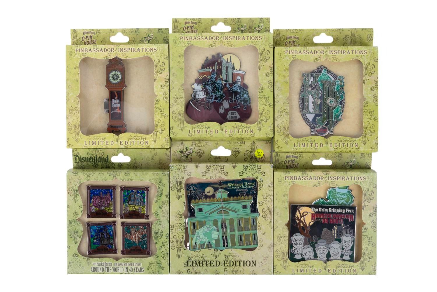 (Disneyland, 2009) A Haunted Mansion O-Pin House Pinbassador Inspirations Pin Collection. Included are 6 limited edition and hard-to-find boxed pins and pin sets released during The Haunted Manion O-Pin House event at Disneyland. The 9 enamel and metal pins feature moving, slider, and glow-in-the-dark parts, with designs by artists Timm Lundeen and Steven Miller. Each pin is in fine condition in the original boxes.