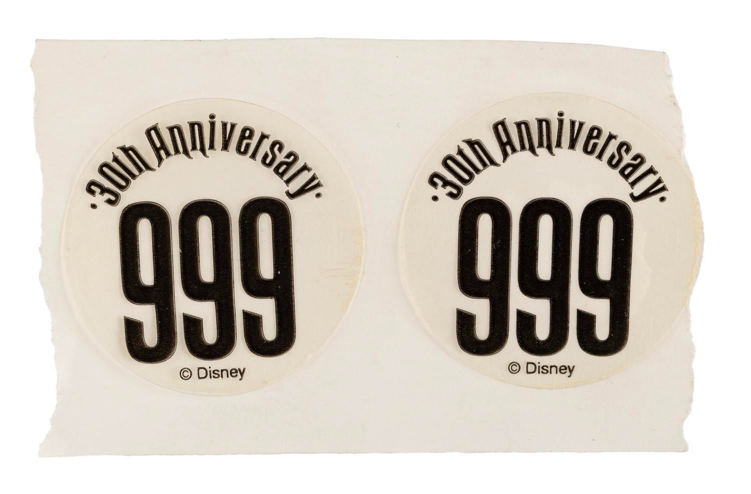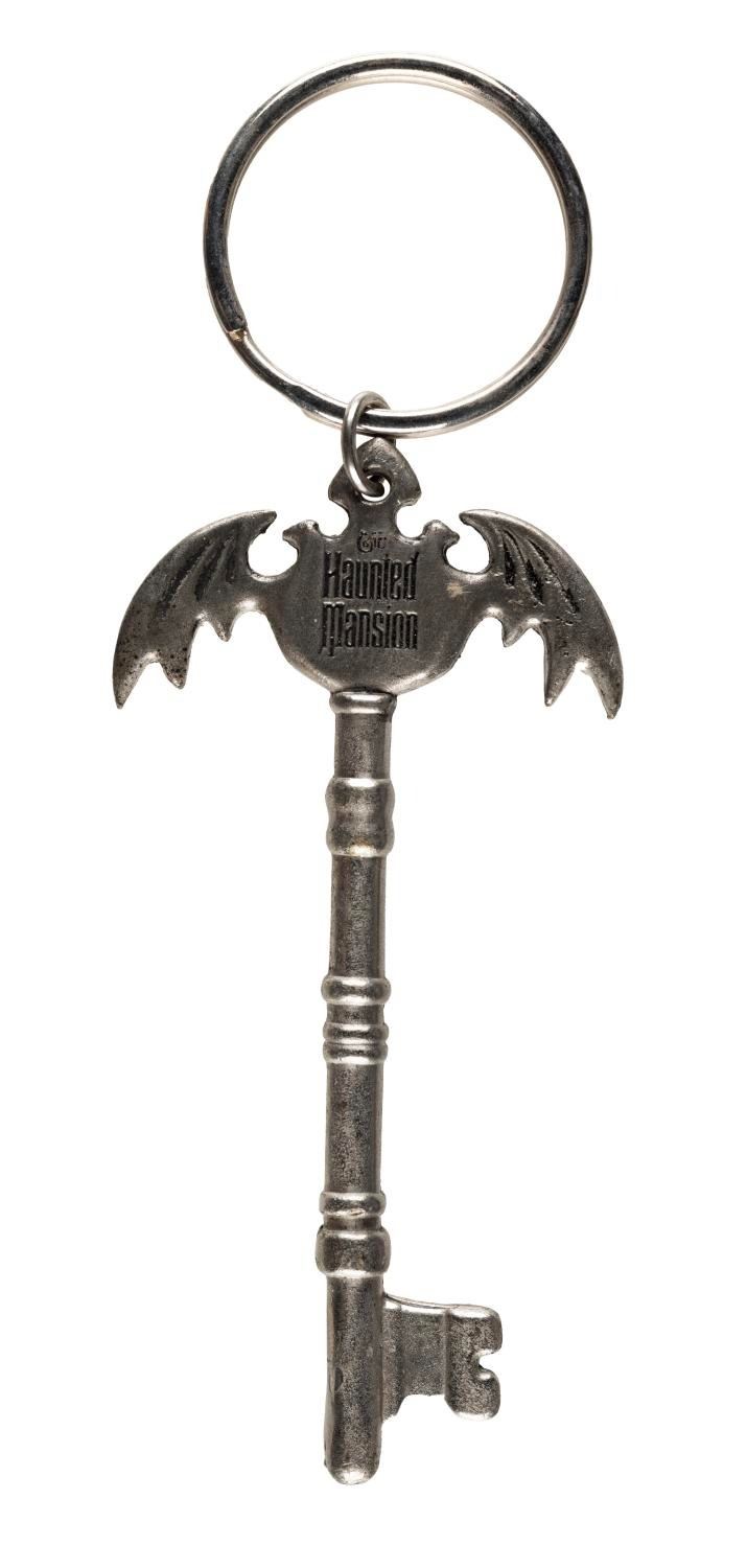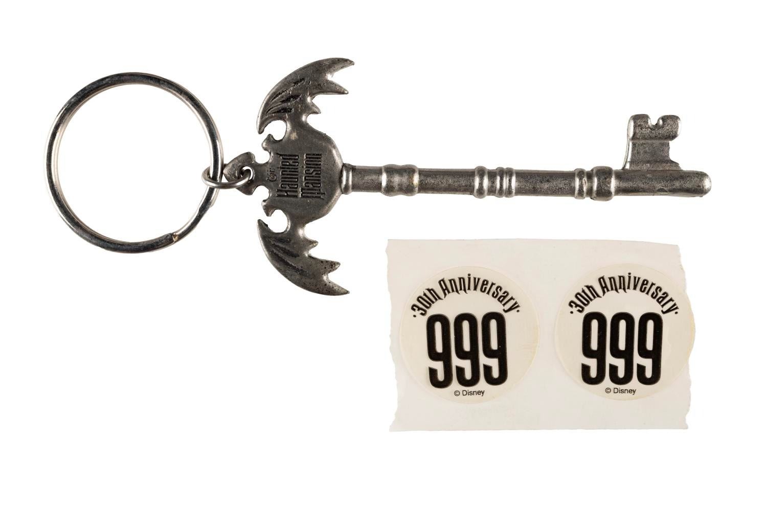 (Disney Parks, 2000s) A Haunted Mansion bat-shaped souvenir keyring, accompanied by two 30th anniversary stickers. Measuring 4"x2.25", this souvenir is in very good condition exhibiting minor wear.