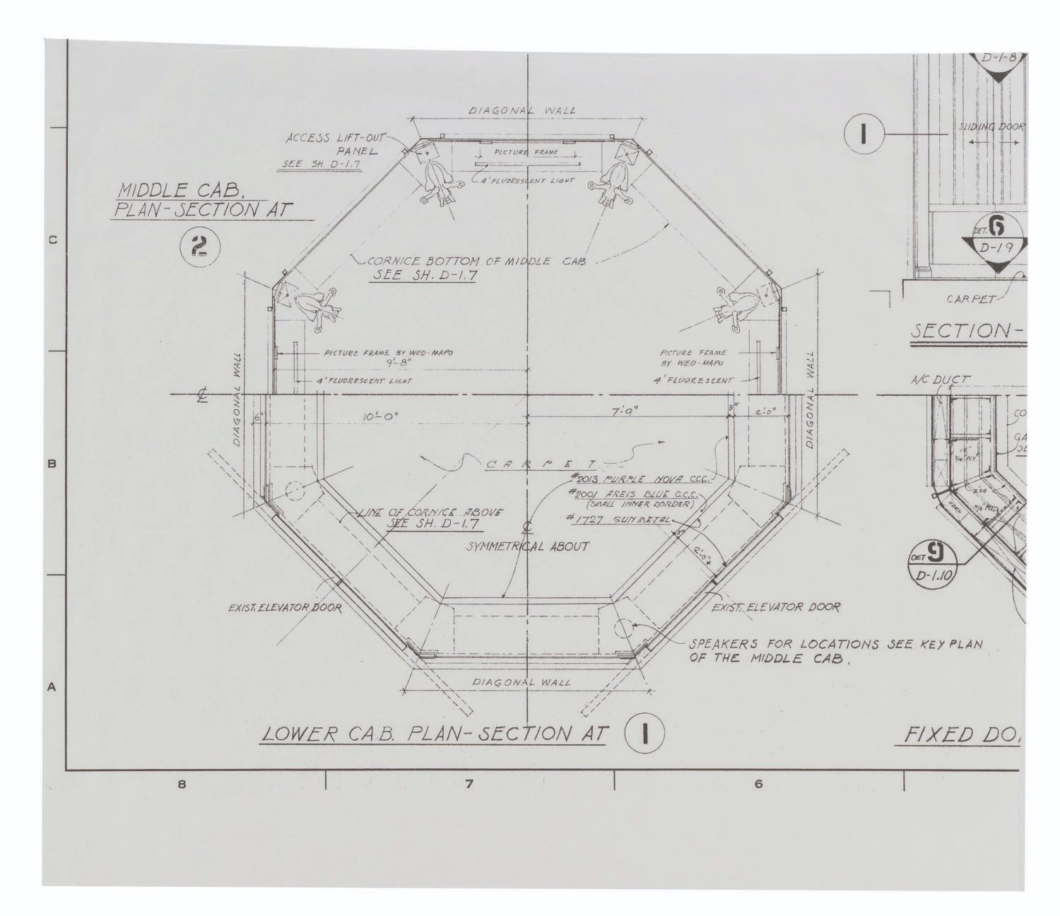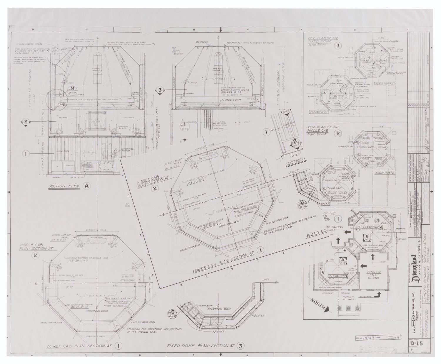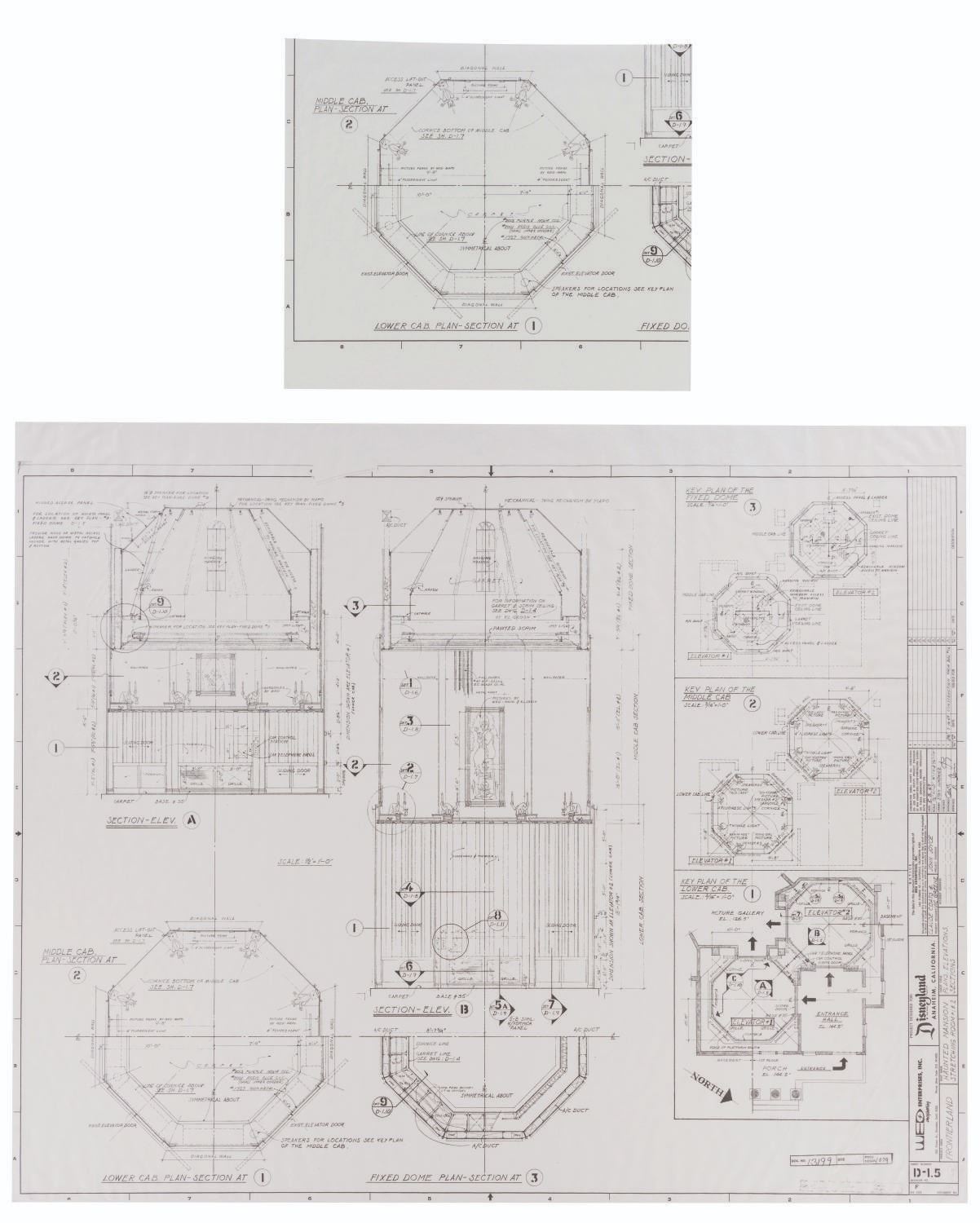 (Disneyland, 1969) A Haunted Mansion Stretching Room Blueprint. This plan, technically a "whiteprint", is of The Haunted Mansion Stretching Room 1 & 2 designed by Walt Disney Imagineers Vic Greene and Claude Coats and dated May 8th, 1969. This large blueprint plan is accompanied by a duplicate print of the "Lower Cab Section." This pair of "whiteprints" may have been printed anytime after 1969. Measuring 44"x36" and 19"x16", both have been stored rolled and are in very good condition with minor creases and wear from use.