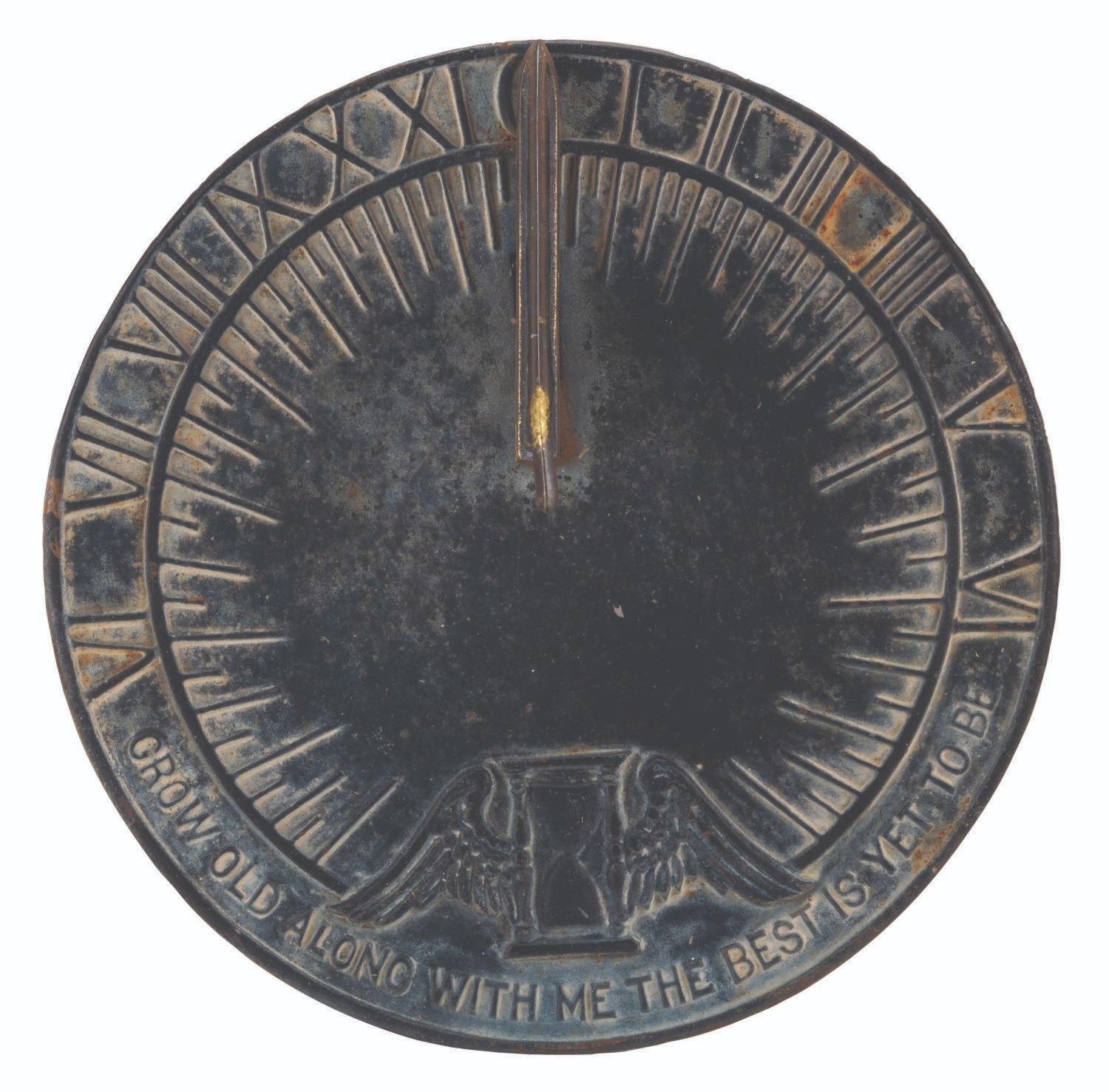 (Disneyland, 2000s) A replica of the sundial from the entrance queue of the Haunted Mansion. This sundial was made by the same foundry that manufactured the original prop used in the Park. It features Roman numerals surrounding the dial plate and a winged hourglass figure. The inscription reads, "Grow Old Along With Me/The Best is Yet to Be." The brass, black bird-form gnomon is attached via a screw on the reverse. Measuring 10.5" in diameter x 3.5" deep, the piece is in good condition with oxidation and weathering from outdoor use.