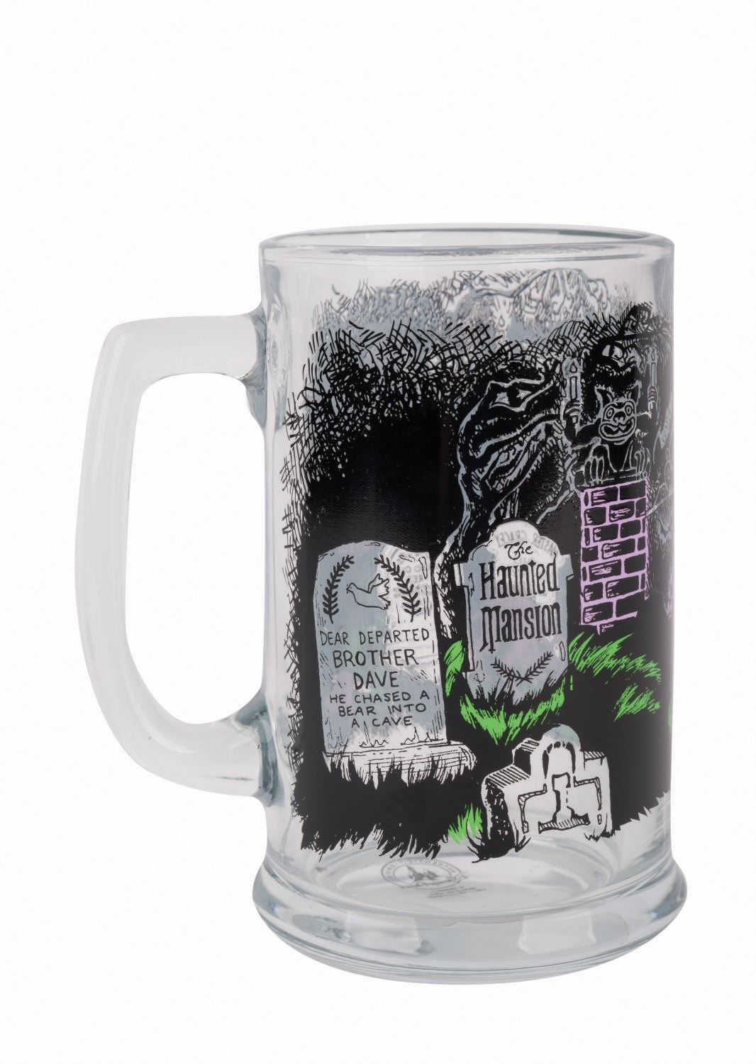 (Disney Parks, 2003) A clear glass mug with illustration of the Haunted Mansion graveyard. The mug is in fine unused condition.